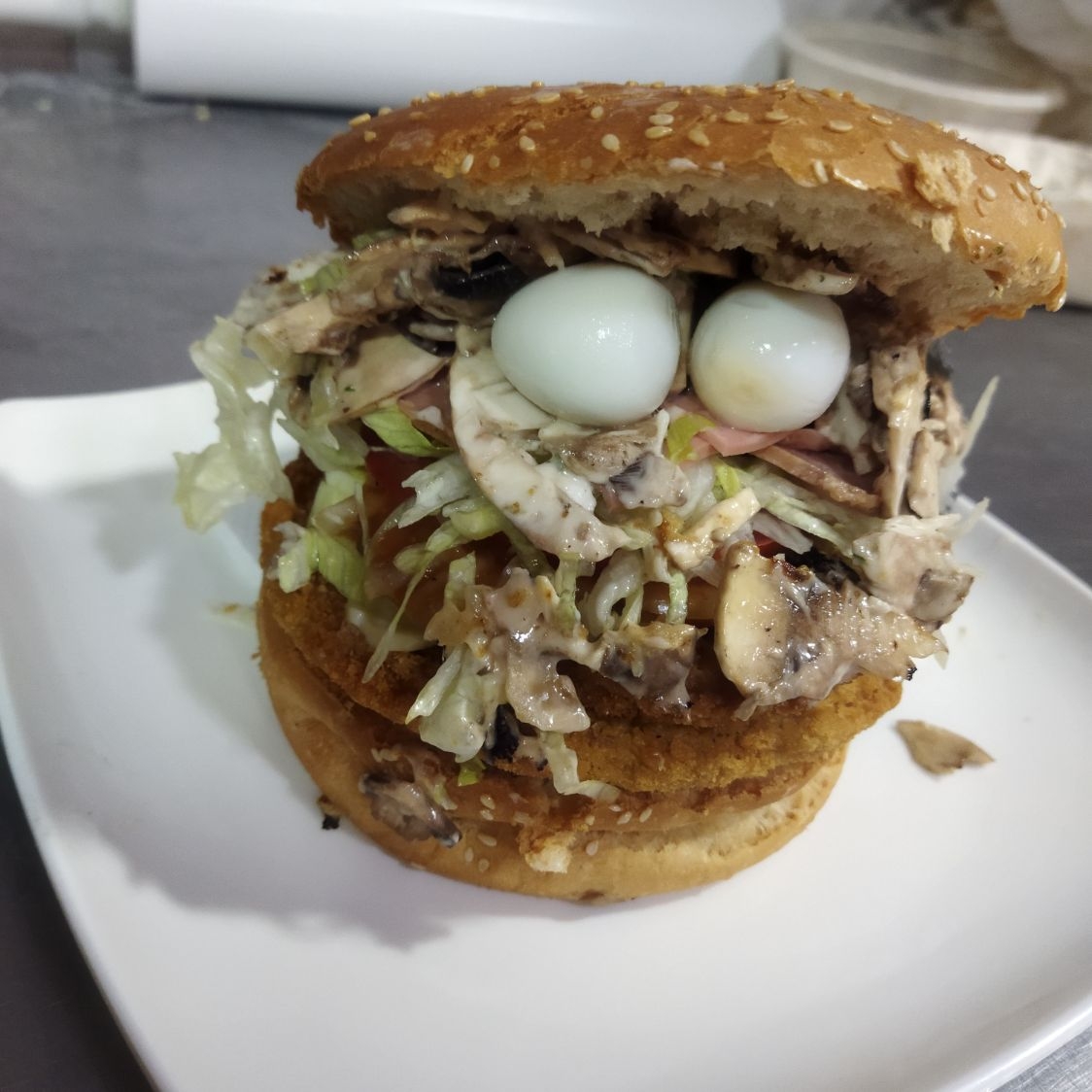 2 Carnes de pollo apanado, queso, lechuga, tomate, cebolla, jamón, mortadela, pollo, champiñón, 2 huevos de codorniz, queso y salsas (tomate, tártara, mayonesa, piña, mostaza, ajo).