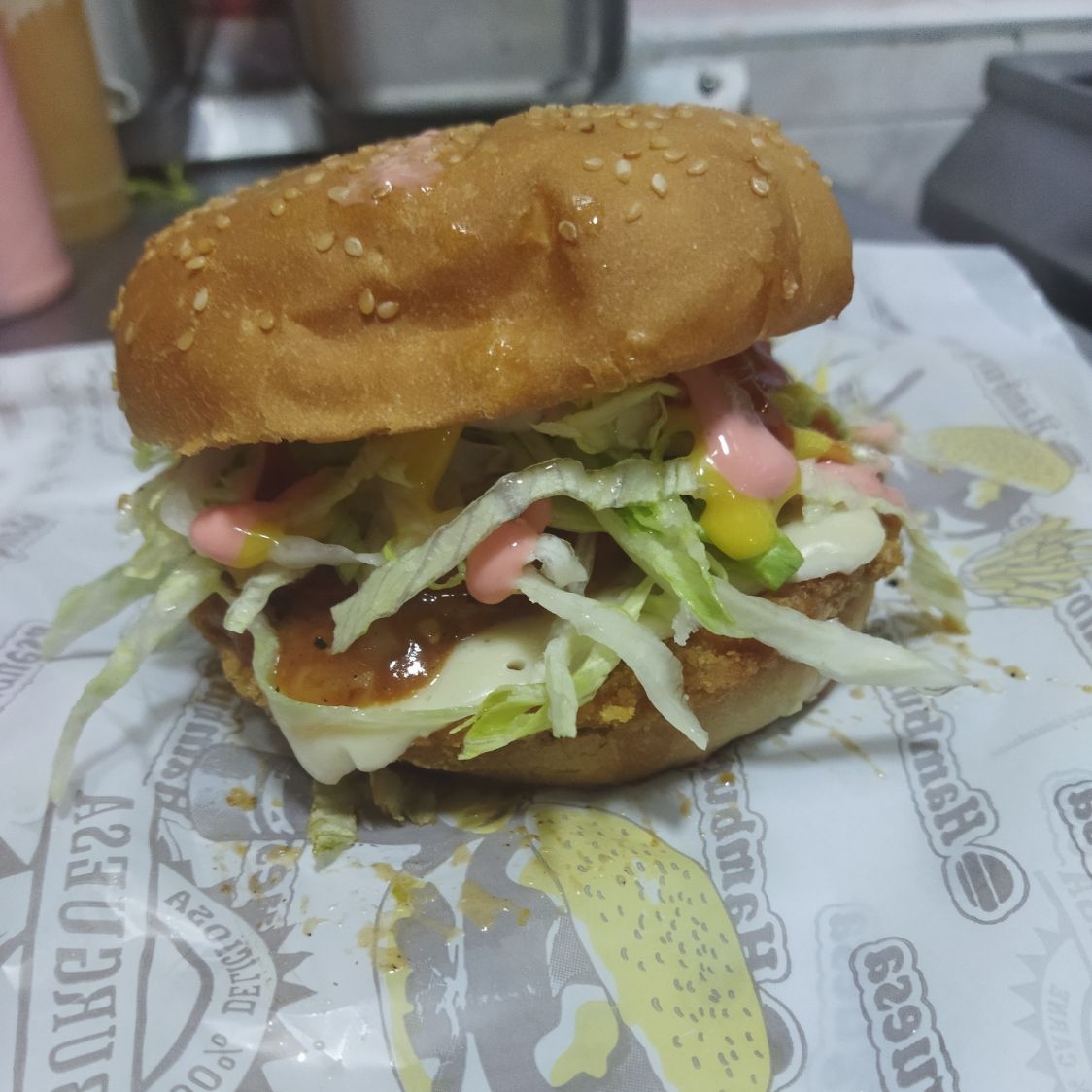 Carne de pollo apanado, queso, lechuga, tomate, cebolla y salsas (tomate, tártara, mayonesa, piña, mostaza, ajo).