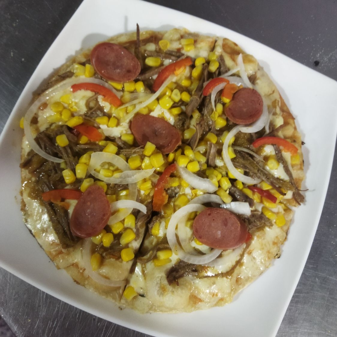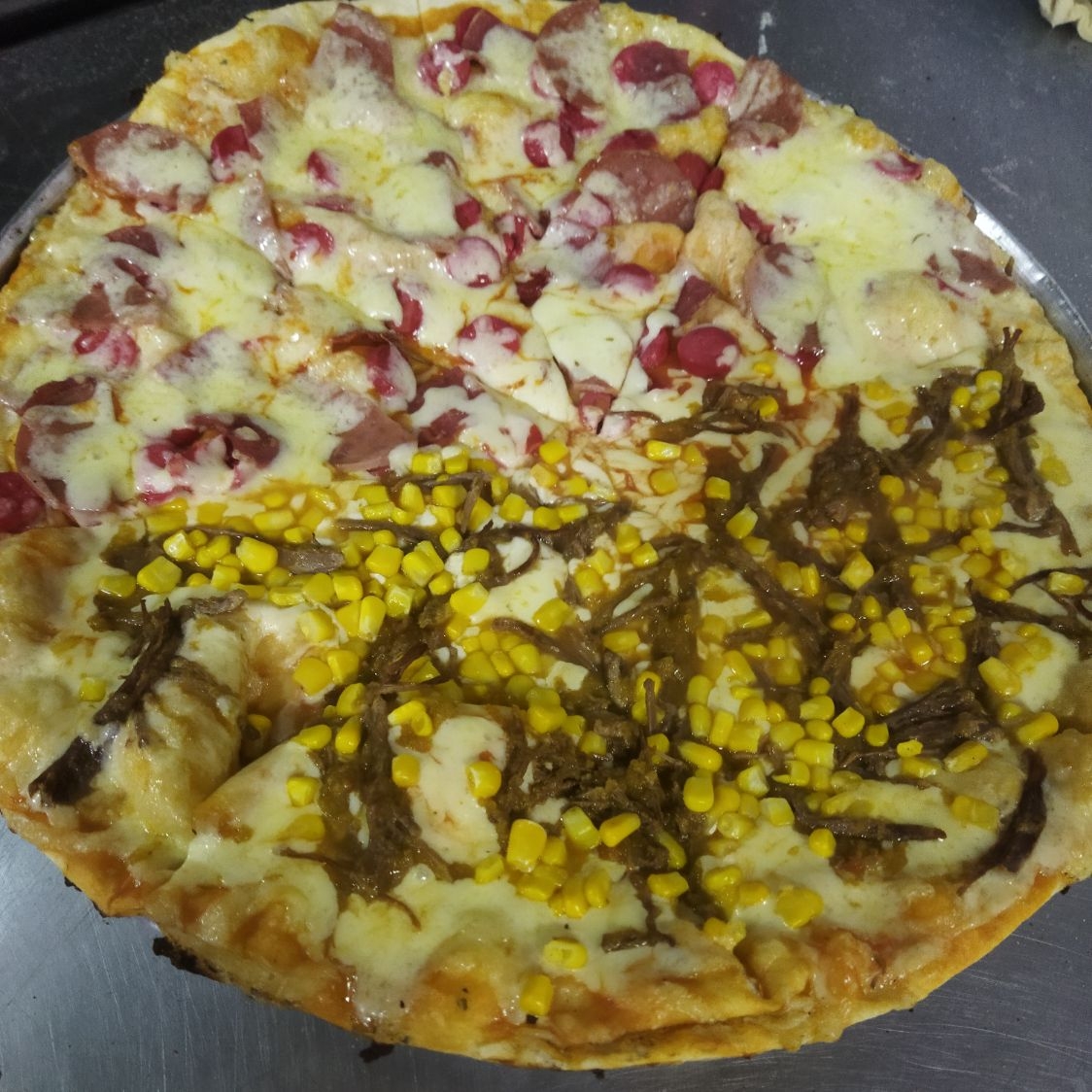Salami, pepperoni, jamón, pollo, champiñón, carne desmechada, hogao, queso, papa chip y huevo de codorniz.