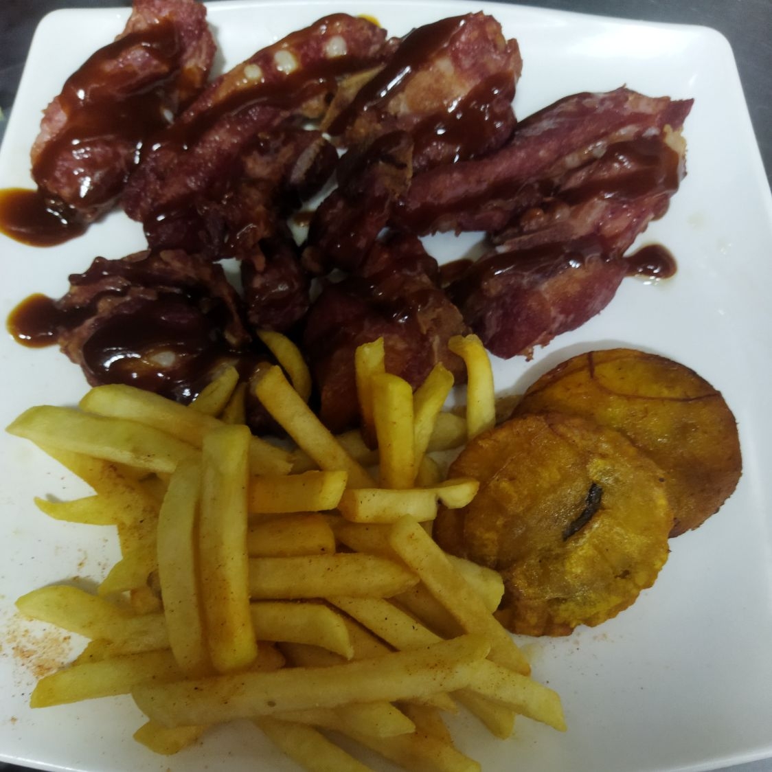 1 lb de costilla de cerdo ahumada acompañada con arroz, ensalada (tomate, cebolla, lechuga y salsa de vinagre), patacón y papa a la francesa.