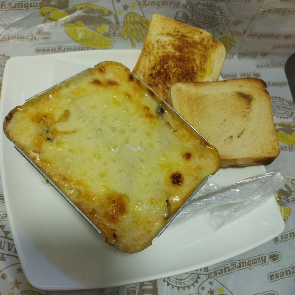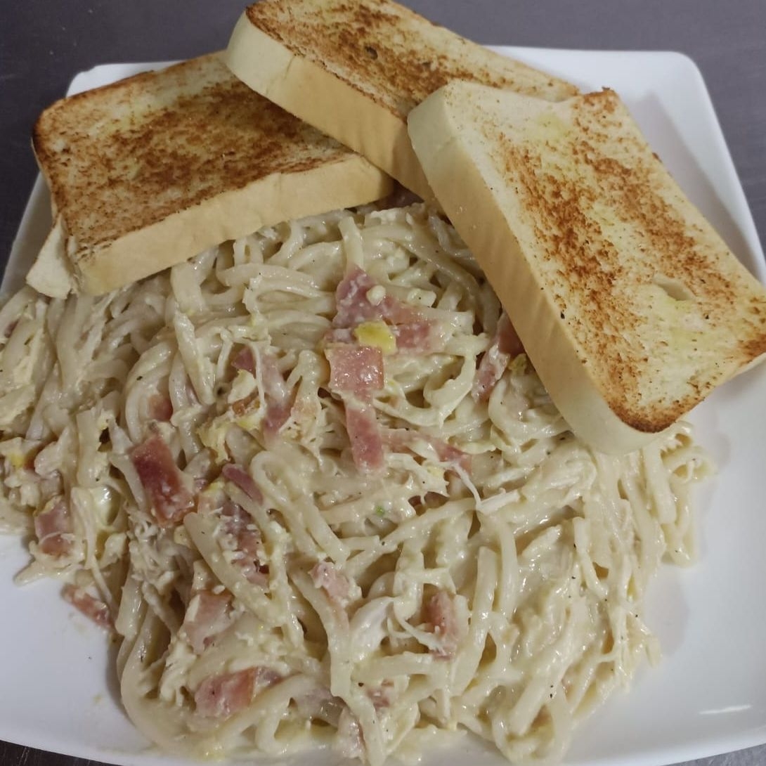 Tocineta, pollo, pastas, huevo batido de gallina, salsa bechamel y queso.