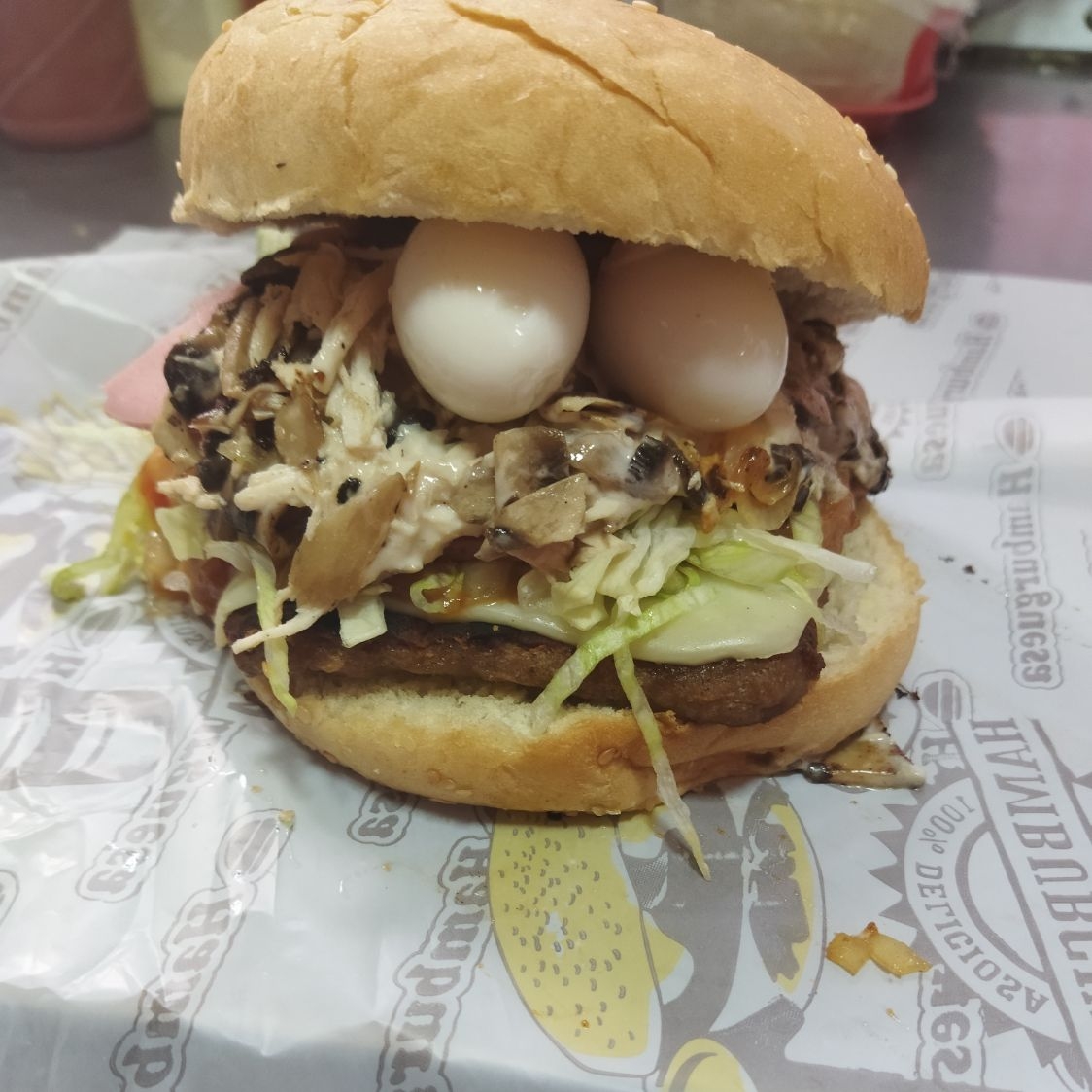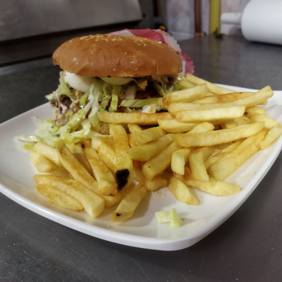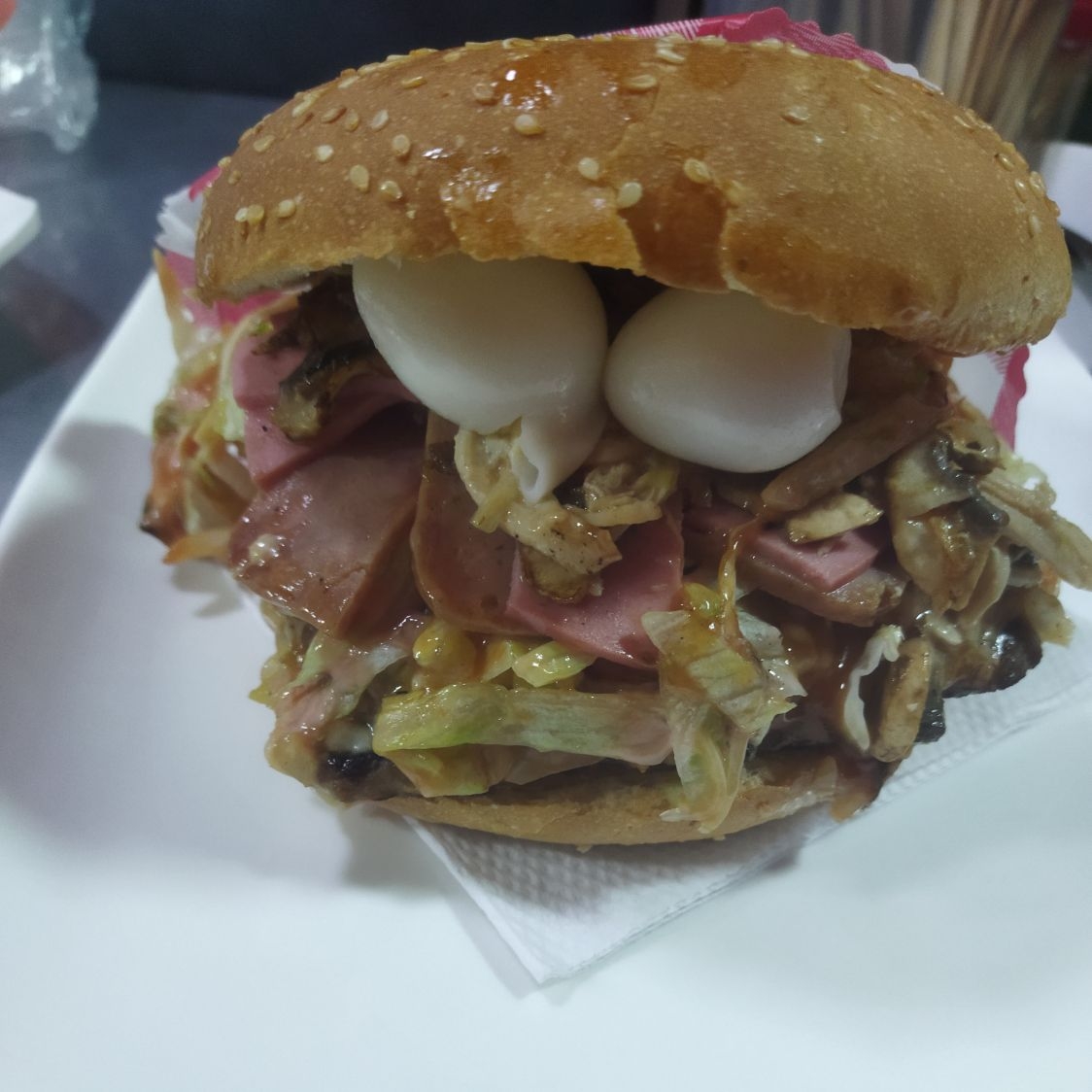 Carne, queso, lechuga, tomate, cebolla, jamón, mortadela, pollo, champiñón, 2 huevos de codorniz, queso y salsas (tomate, tártara, mayonesa, piña, mostaza, ajo).