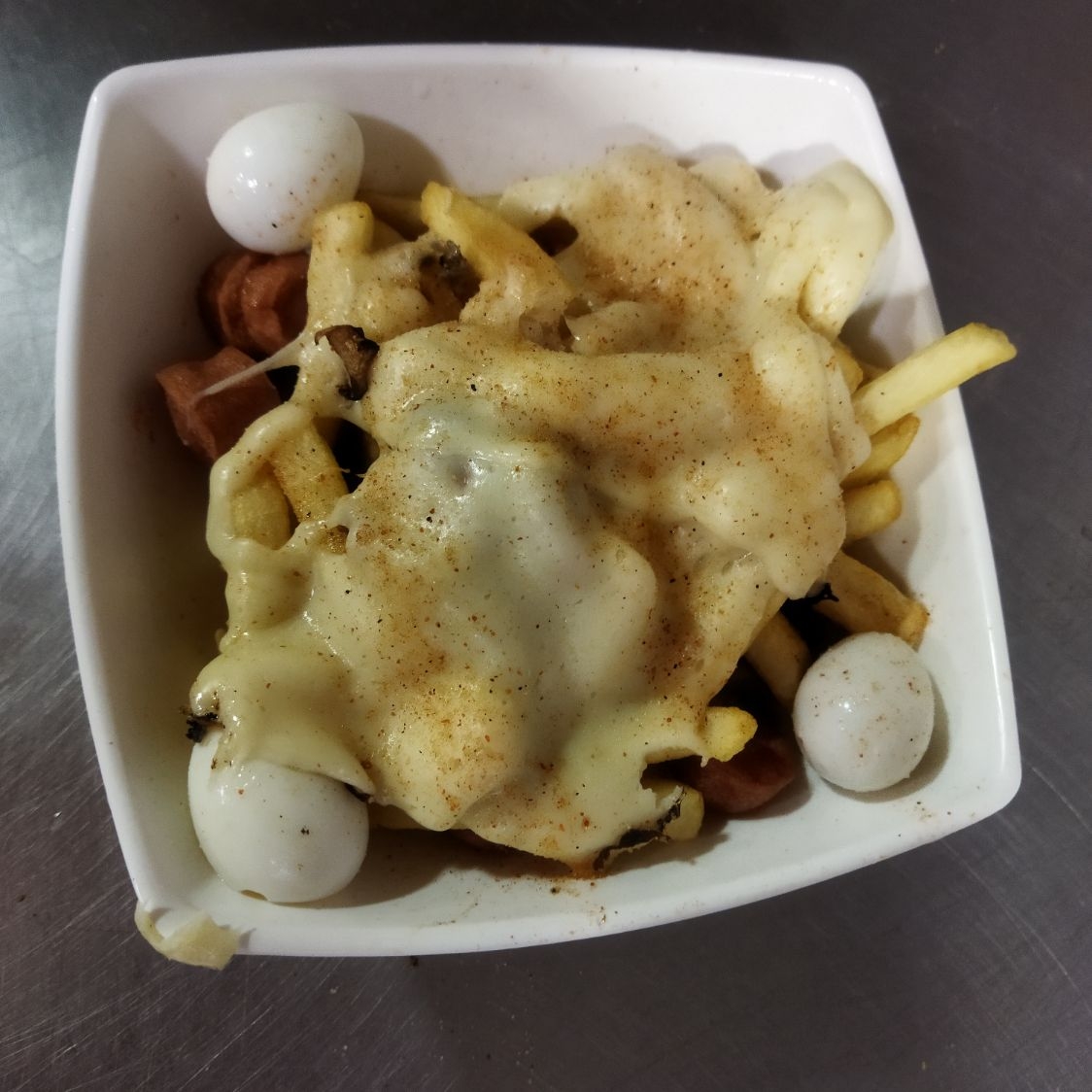 Porción de papa a la francesa, 2 salchichas, queso y 4 huevos de codorniz.