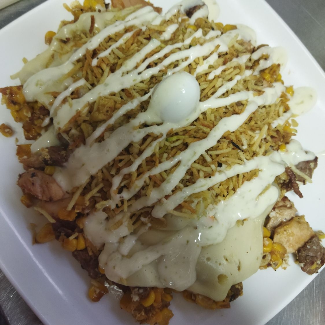2 Salchichas, pollo, carne desmechada, maíz, tocineta, tomate, cebolla, cilantro, jalapeños, 5 huevos de codorniz, 1 huevo batido de gallina, tostacos, queso y salsas (tomate, tártara, mayonesa, piña, mostaza, ajo).