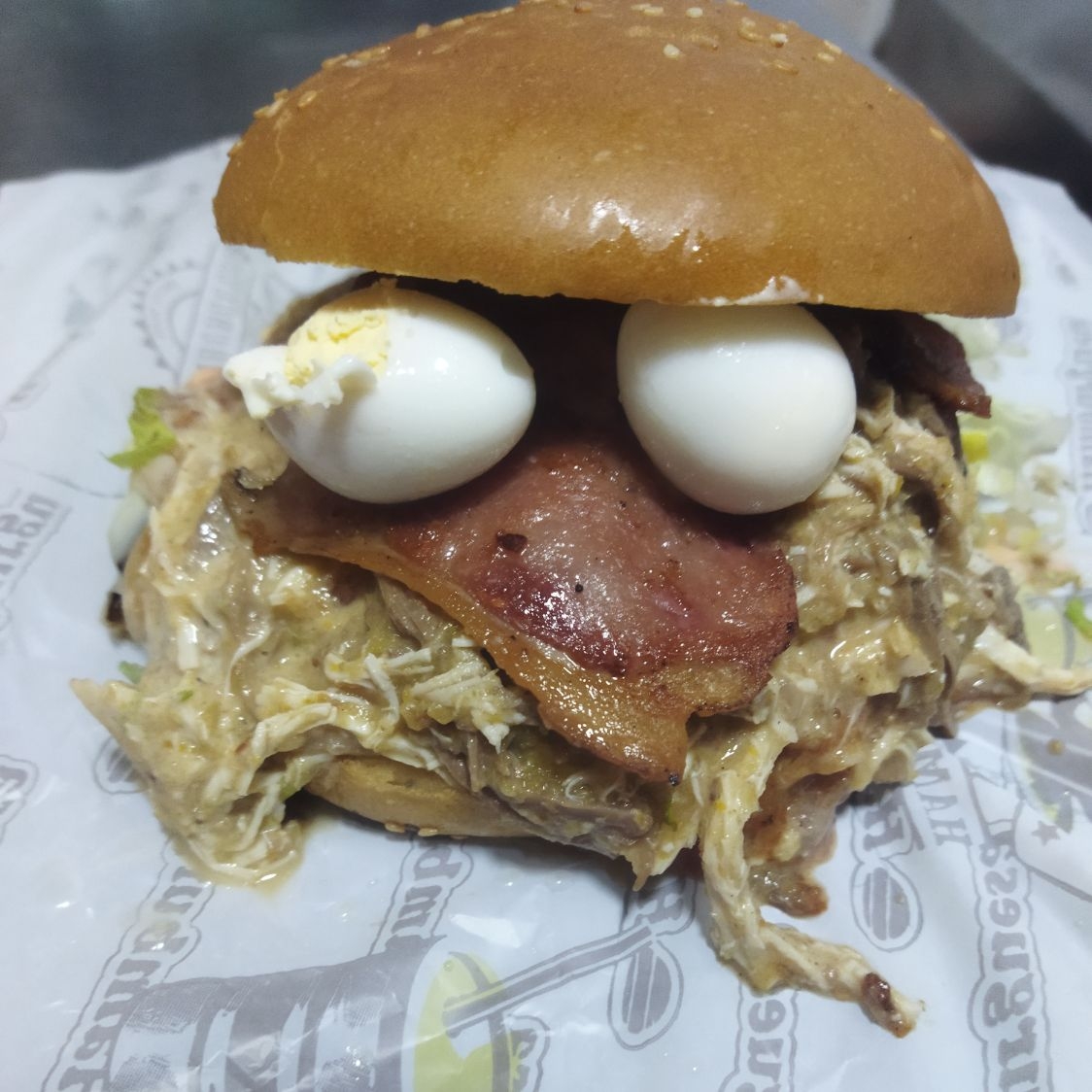 Carne de pollo apanado, queso, lechuga, tomate, cebolla, jamón, mortadela, pollo, champiñón, 2 huevos de codorniz, queso y salsas (tomate, tártara, mayonesa, piña, mostaza, ajo).