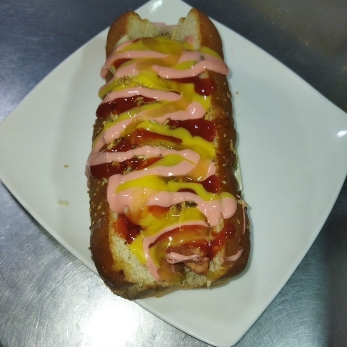 Carne de pollo apanado, queso, lechuga, tomate, cebolla, maíz, carne desmechada, jalapeño y salsas (tomate, tártara, mayonesa, piña, mostaza, ajo).