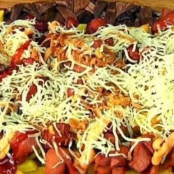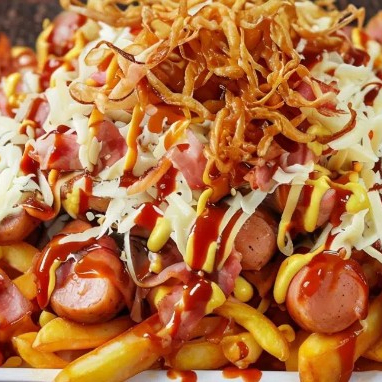 Trocitos de carne de pollo, salchicha, butifarra y chorizo salteados con pimentón, cebolla, paprika y un toque de salsa Worcestershire, servidos sobre una cama de papas rústicas fritas, queso mozzarella y papas cabello de ángel. Aproximadamente 450 gramos.
