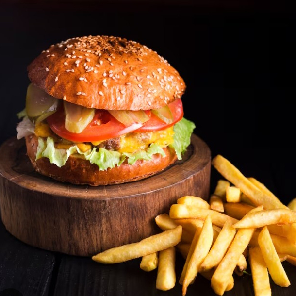 hamburguesa de res lechuga tomate cebolla carameliza queso jamon salsas acompañada de una porcion de papas rusticas fritas