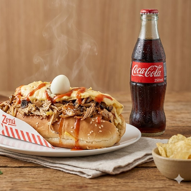 Papa francesa de 300grs, queso, pollo desmechado, dos salchichas zenú, carne desmechada.