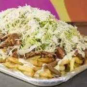 Platillo individual: 320 g de papa francesa, salchicha americana, carne, pollo, tocineta, queso costeño, vegetales frescos y salsas.