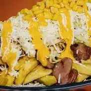 Salchicha americana, pollo, champiñón, maíz, cebolla, queso, salsas acompañado de papas y gaseosa