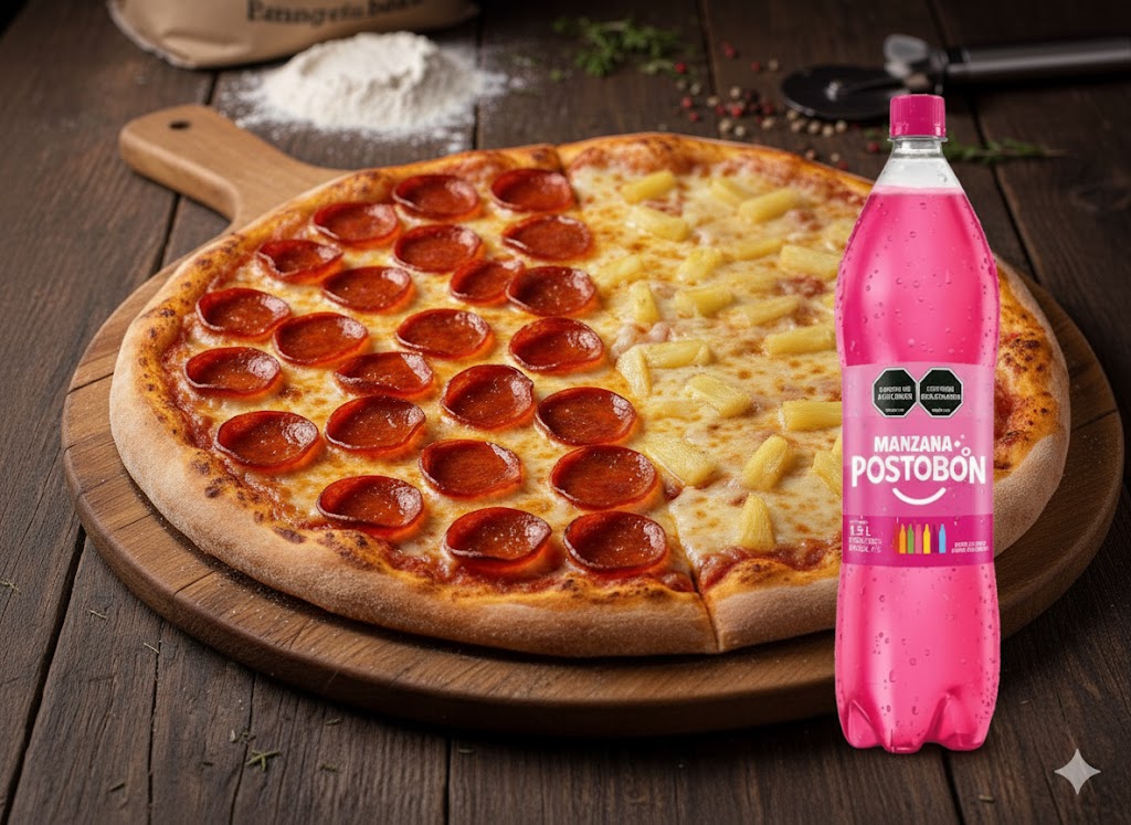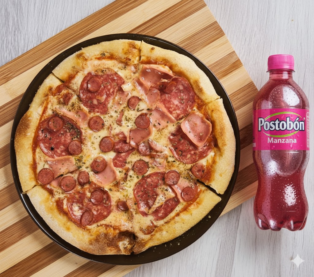 Pizza Mediana de 40cm partida en 8 porciones puedes seleccionar hasta 2 sabores + Gaseosa Postobon 1LT