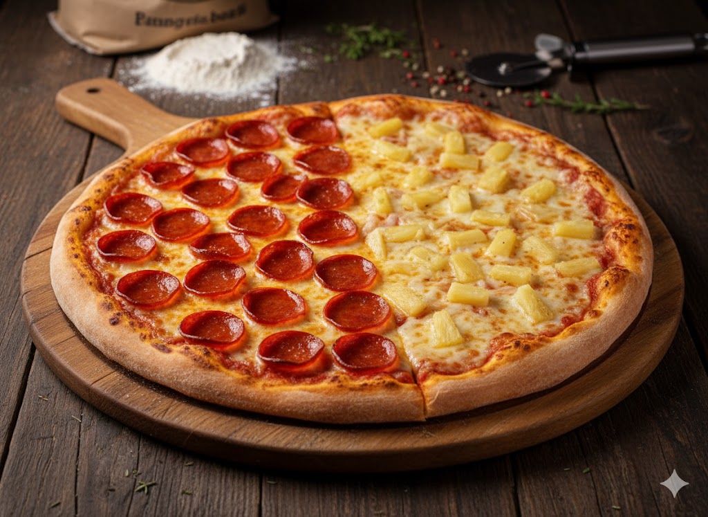 Pizza mediana de 40 cm, dividida en 8 porciones. Puedes elegir hasta 2 sabores. Ideal para máximo 4 personas.