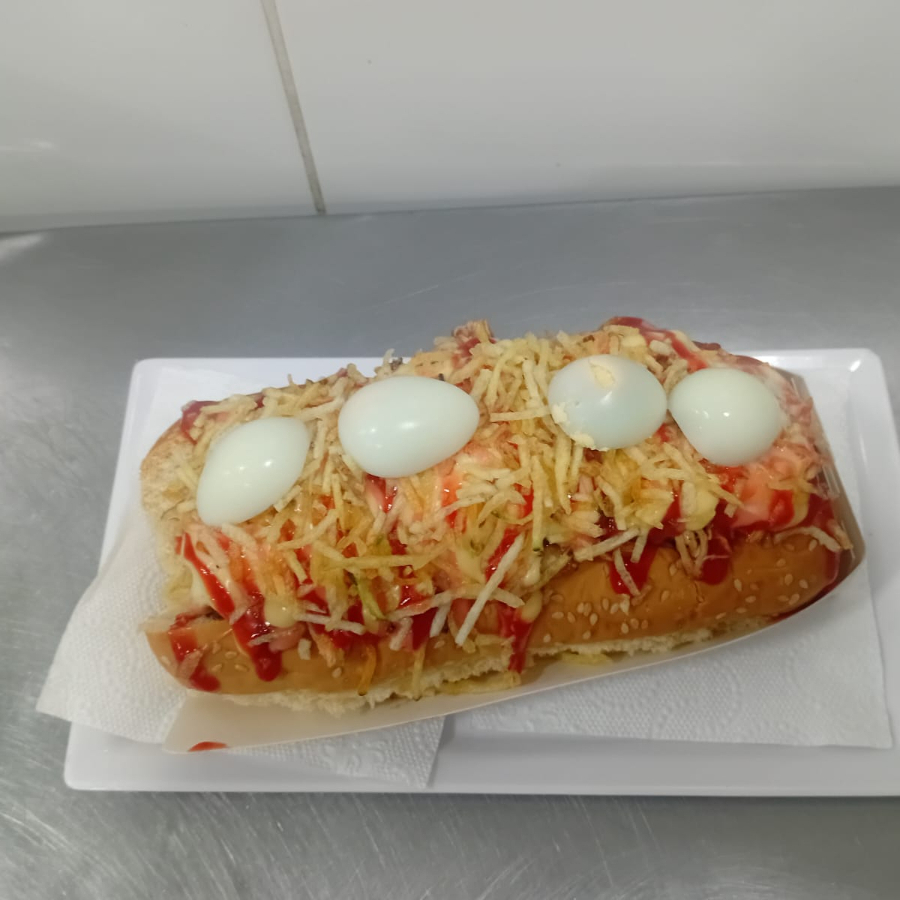 Pan, salchicha americana, cebolla, carne desmechada 120 g, maíz, salsas, papa miga, queso y huevos de codorniz.