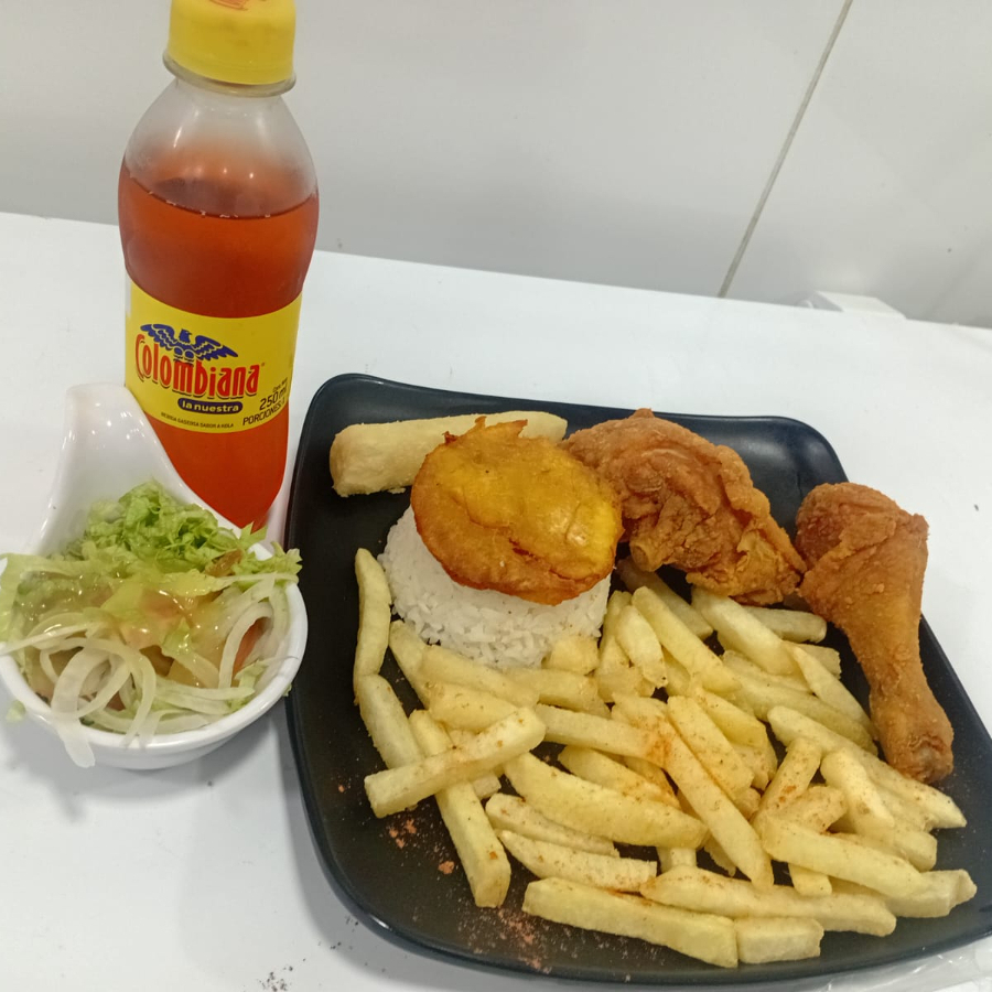 Cuarto de pollo broaster, una porción de arroz, papa francesa, yuca, patacón, ensalada y gaseosa 250 ml.