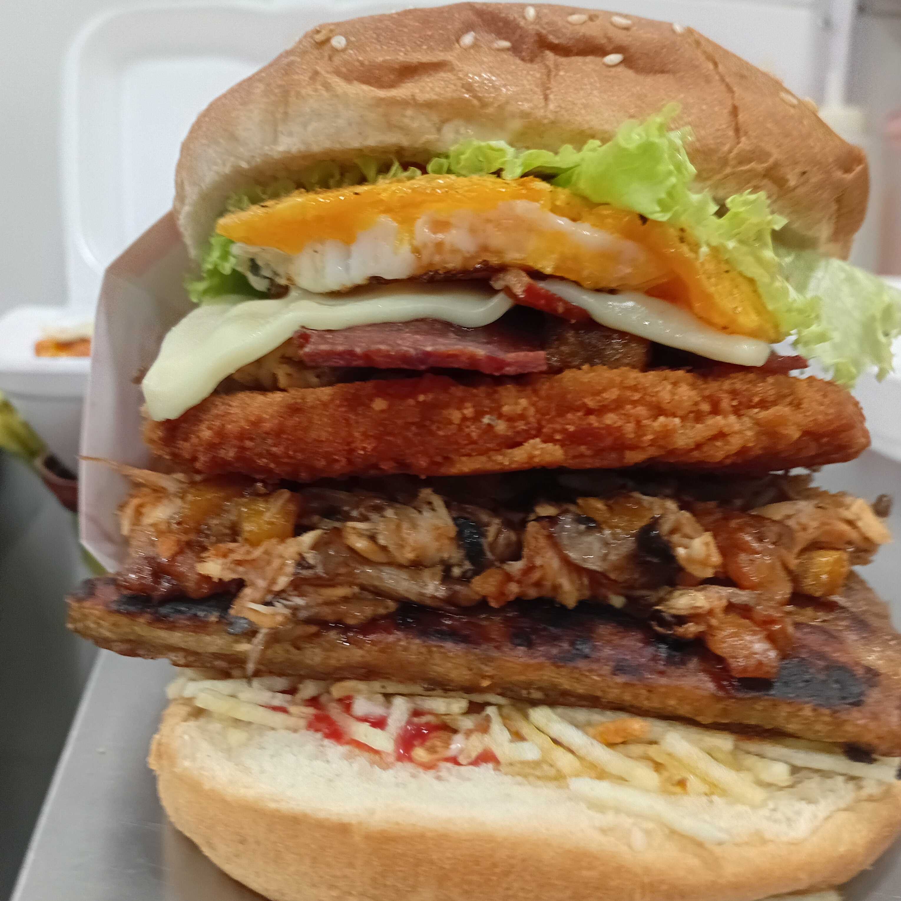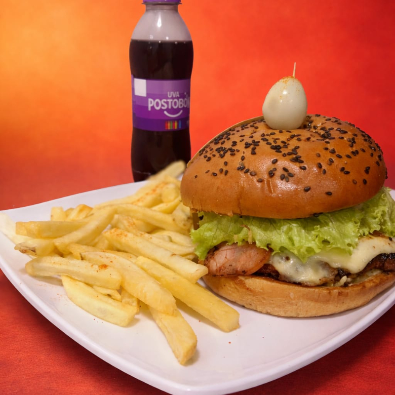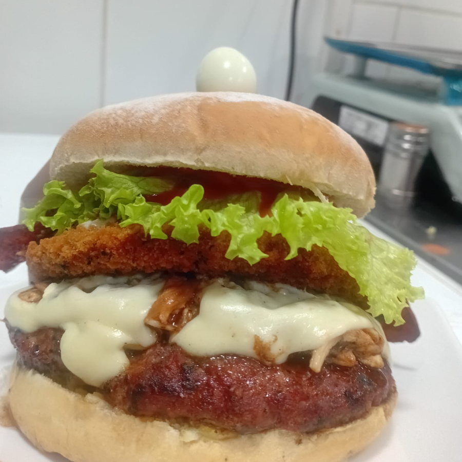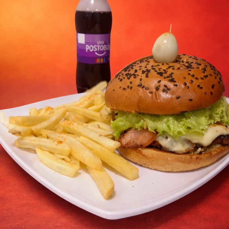 Pan, carne artesanal o pollo apanado 120 g, cebolla, tomate, lechuga, papa miga, huevo frito, plátano maduro, tocineta, salsas, huevo de codorniz y queso.