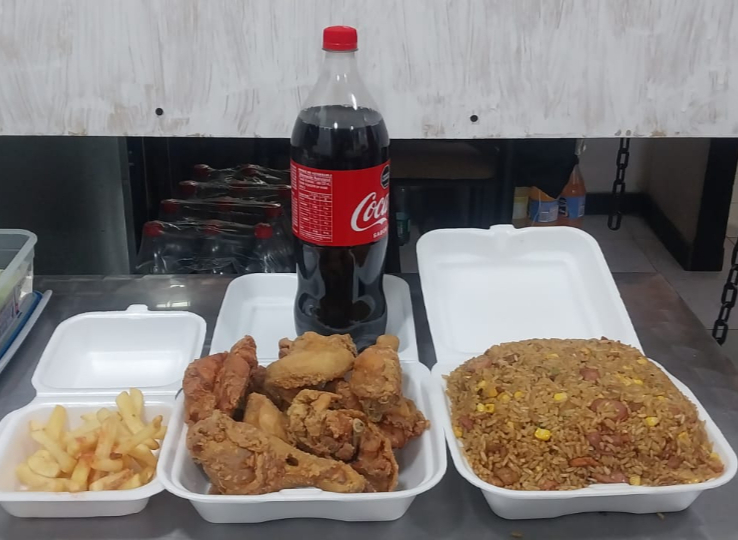 Un pollo broaster, papa francesa, gaseosa 1.5 L, maíz, chorizo, costillas, chicharrón y plátano maduro.
