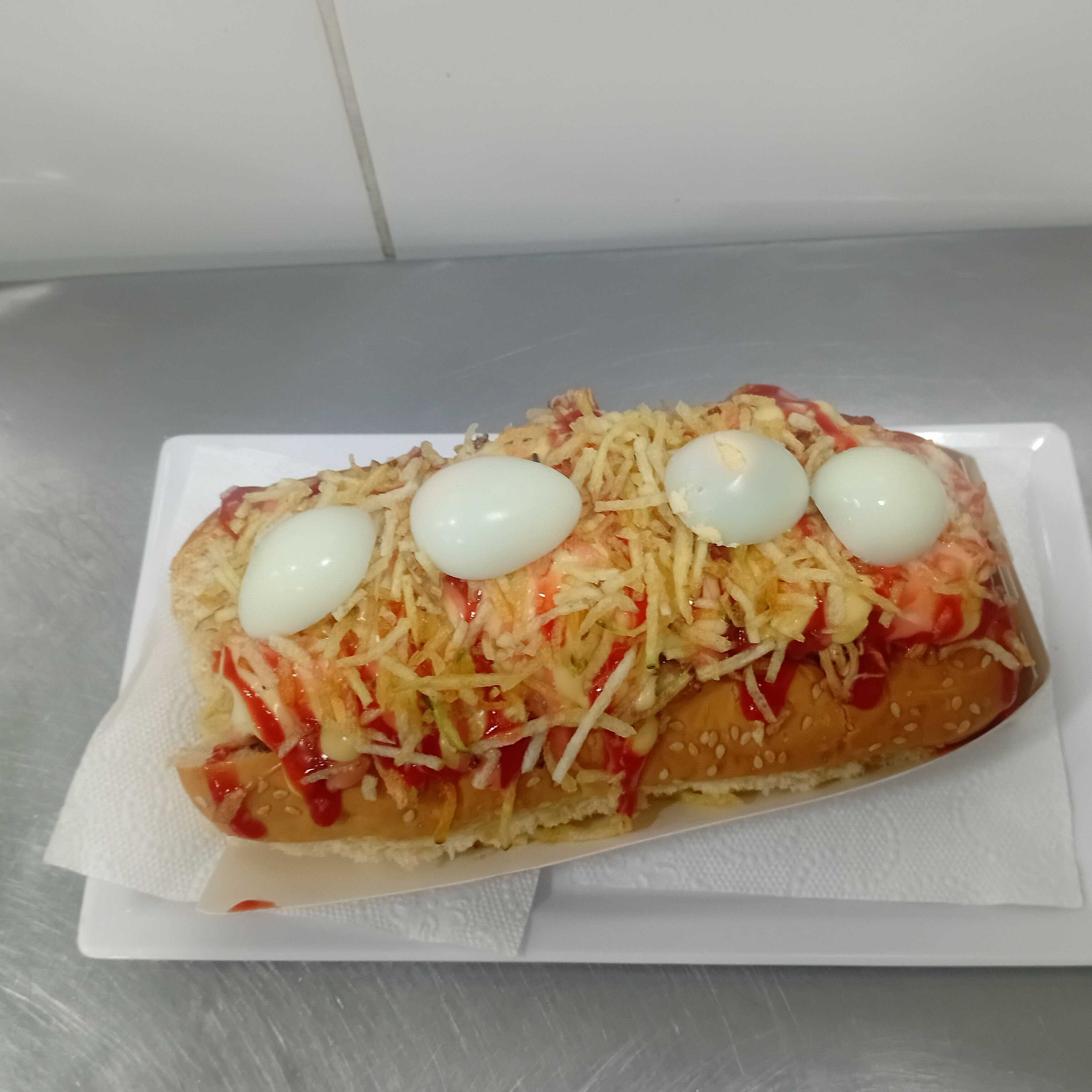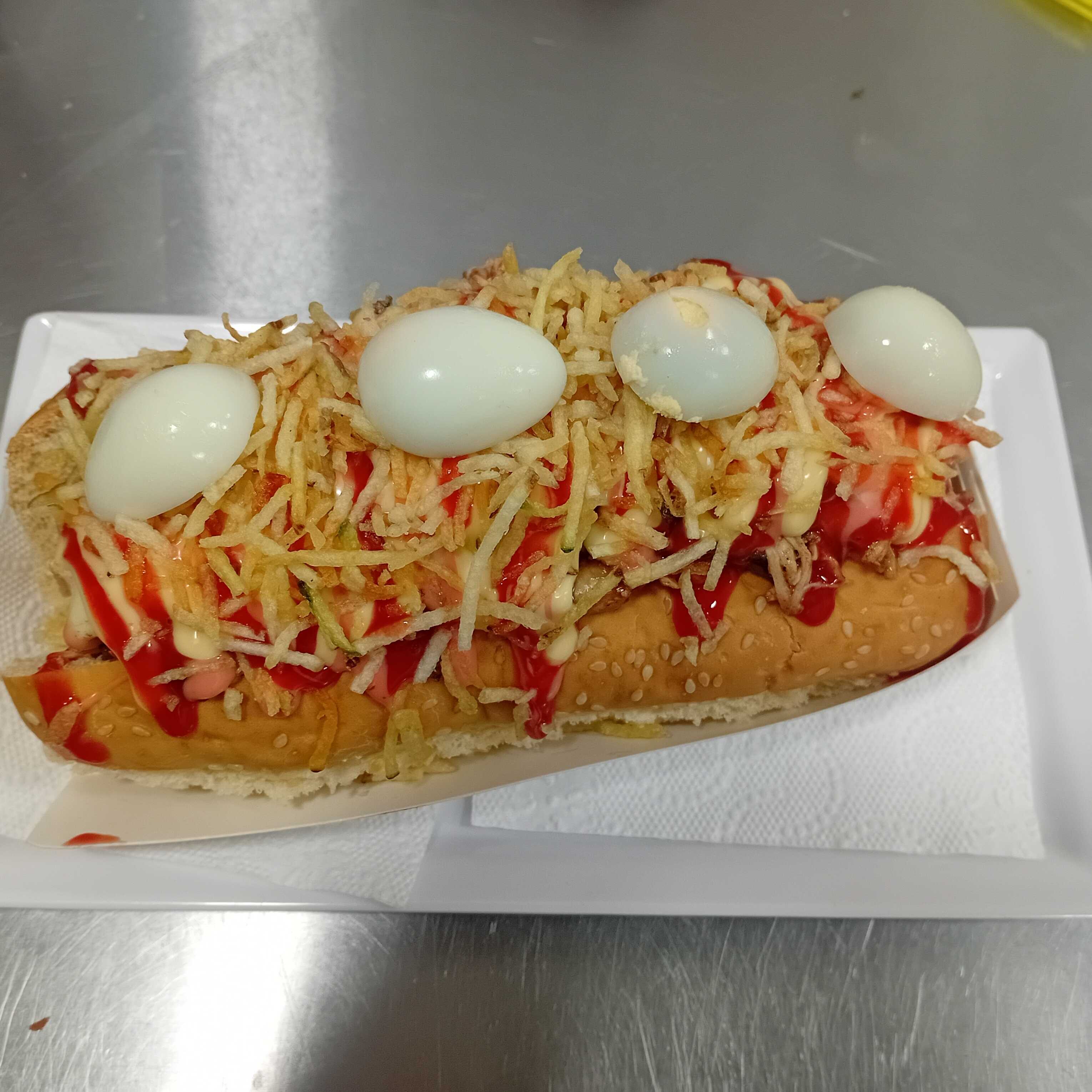 Pan, salchicha americana, cebolla, papa miga, salsas, queso y huevos de codorniz.