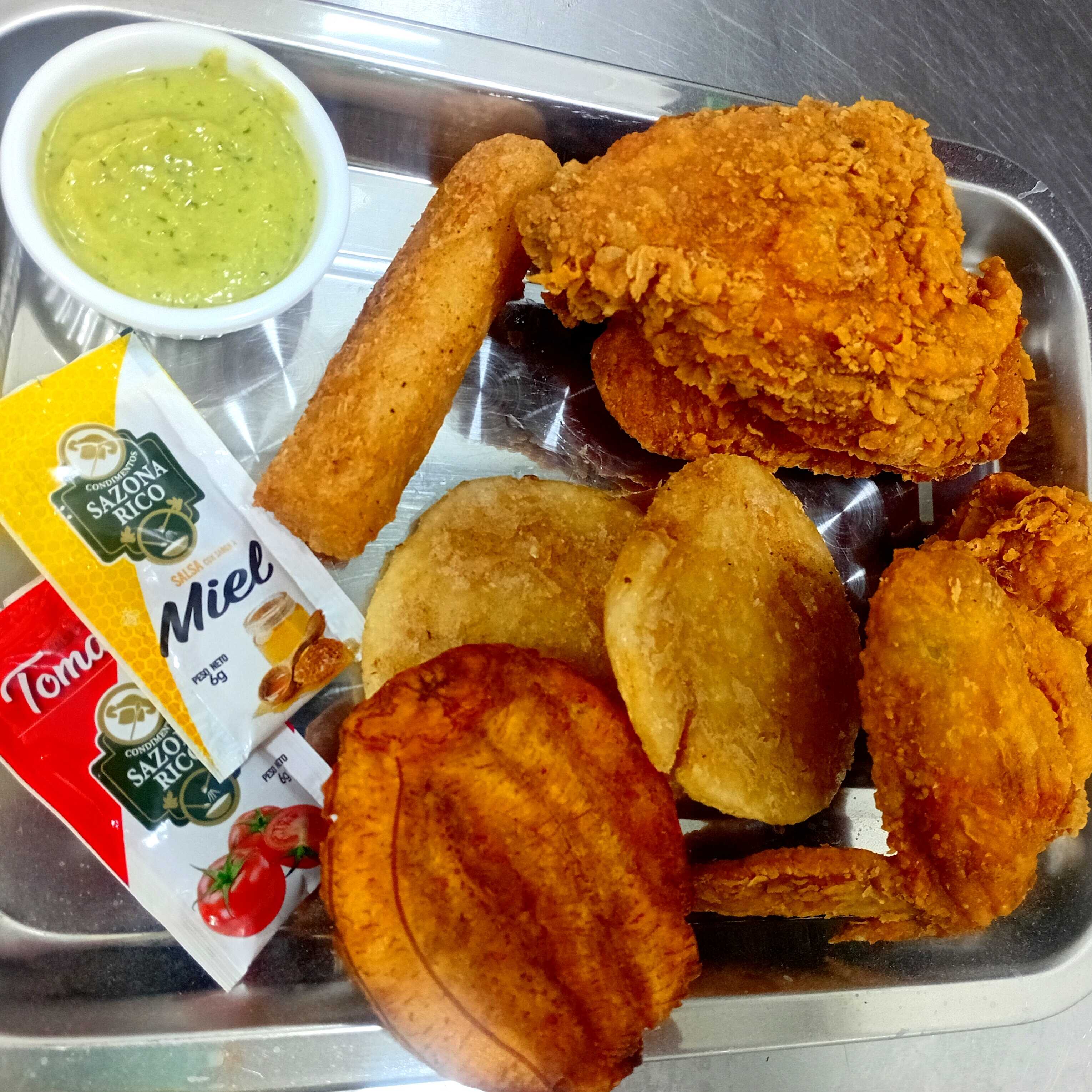 Una papa francesa, patacón, arepa y salsas miel y ají.
