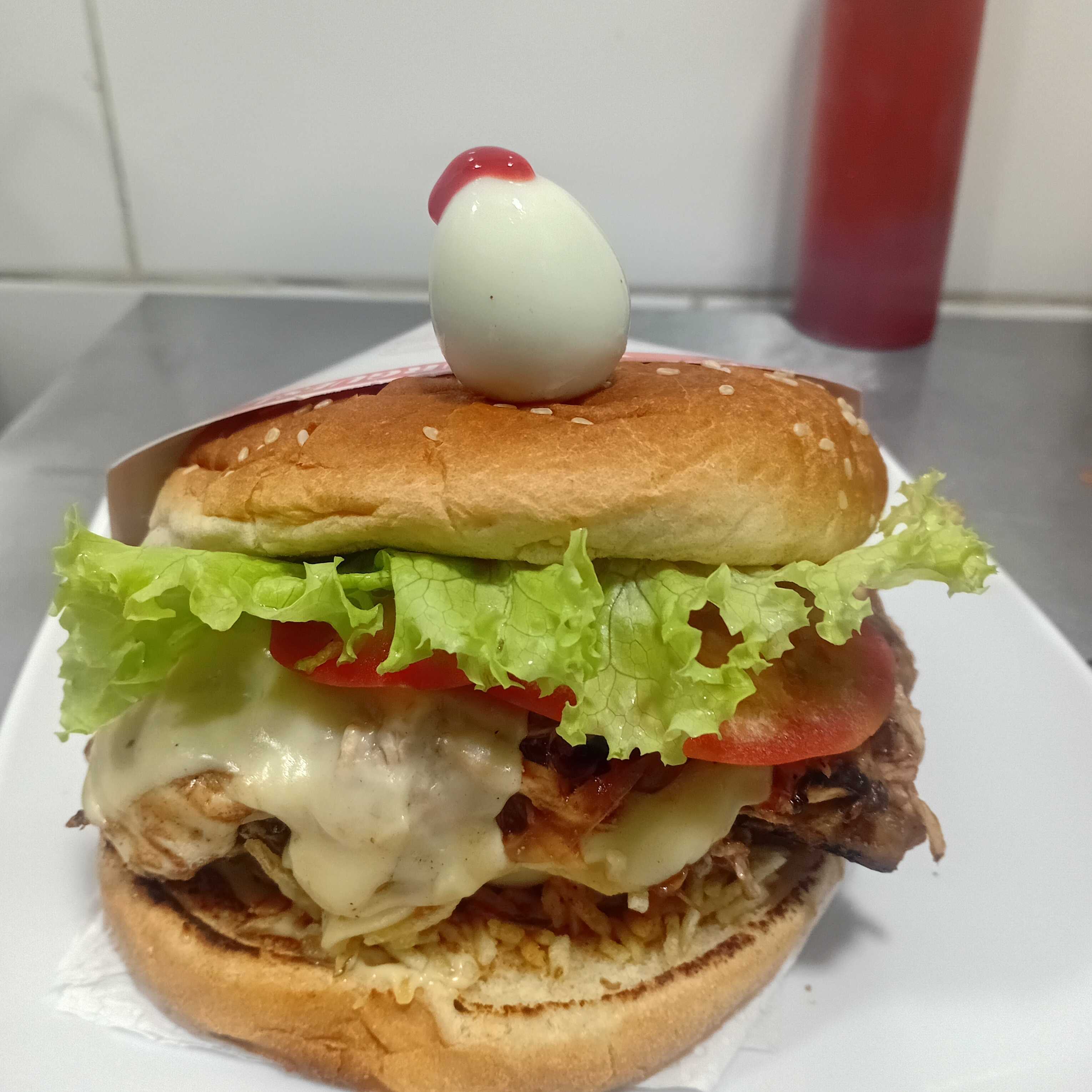 Pan, carne artesanal o pollo apanado 120 g, cebolla, tomate, lechuga, papa miga, salsas, queso y huevo de codorniz.
