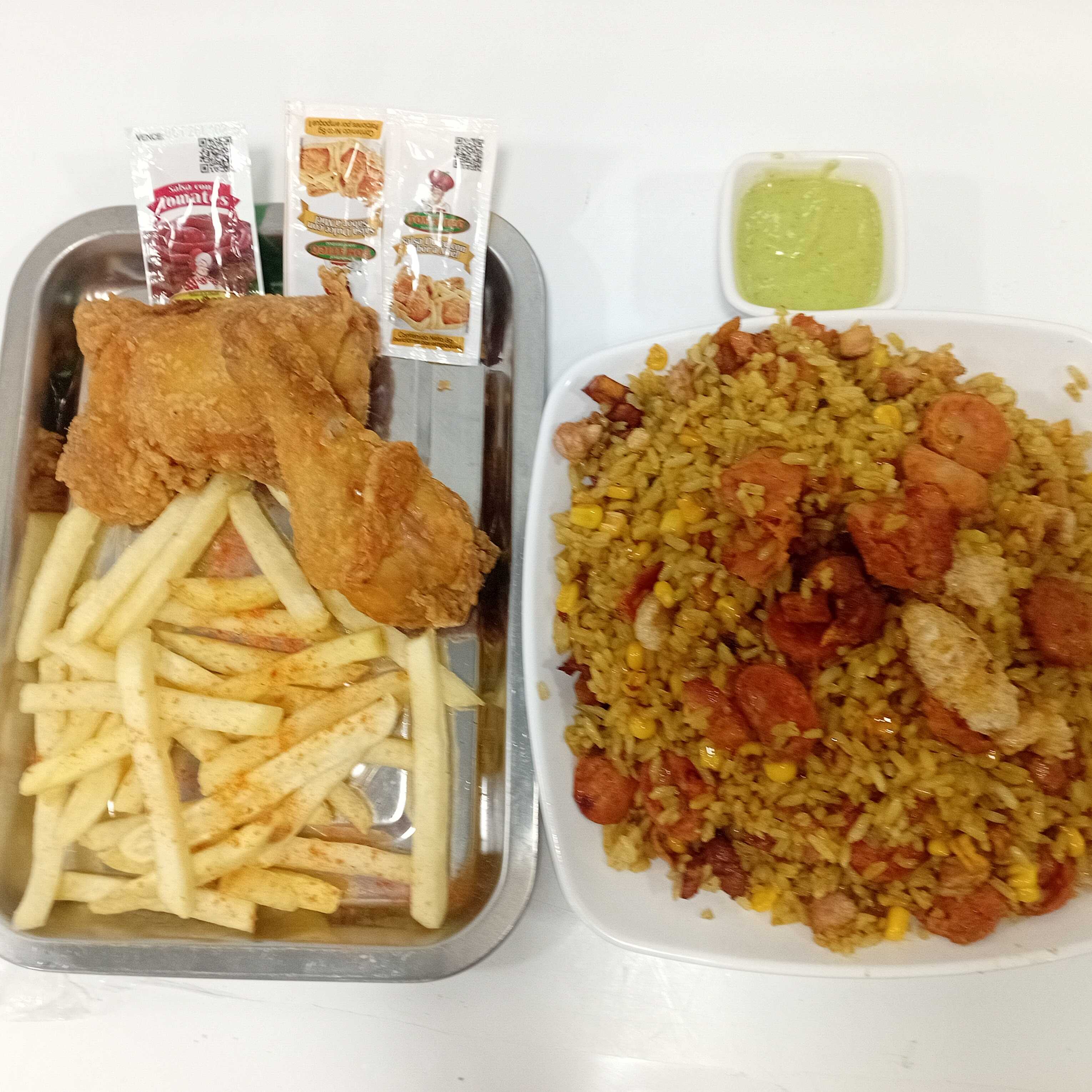 Cuarto de pollo broaster, una porción de papa francesa, maíz, chorizo, costillas, chicharrón y plátano maduro.