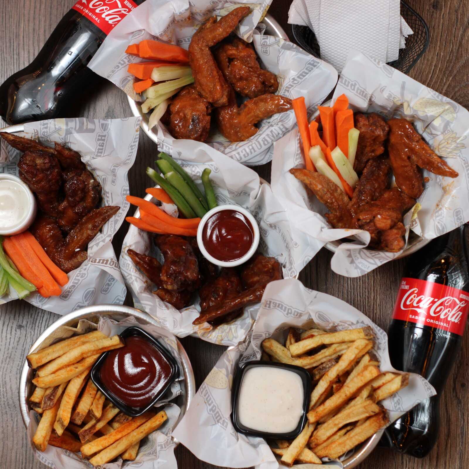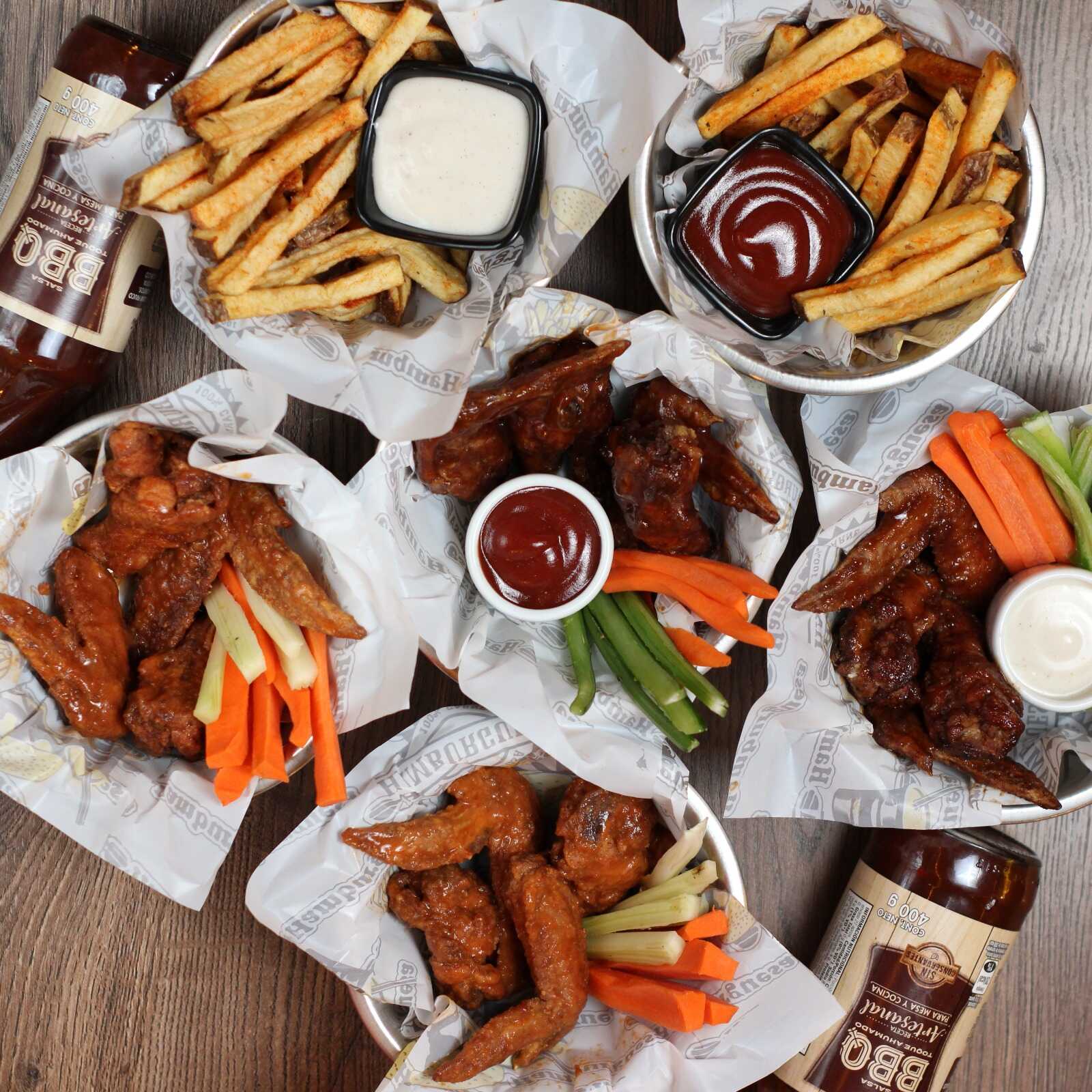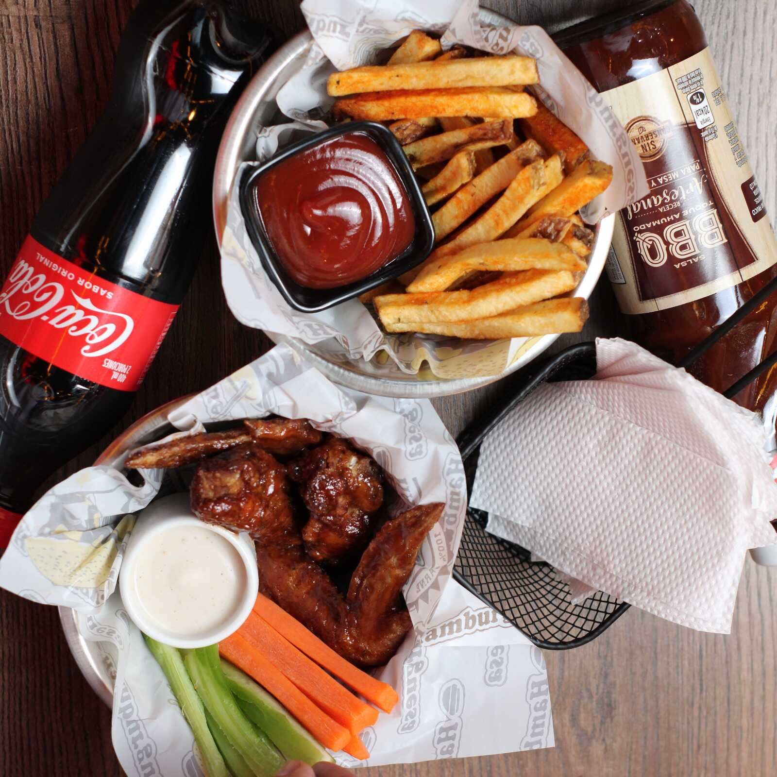 16 Piezas de alitas de pollo fritas y marinadas en especias de la casa más 2 hamburguesas cheese bacon más 4 papas artesanales y 4 bebidas.