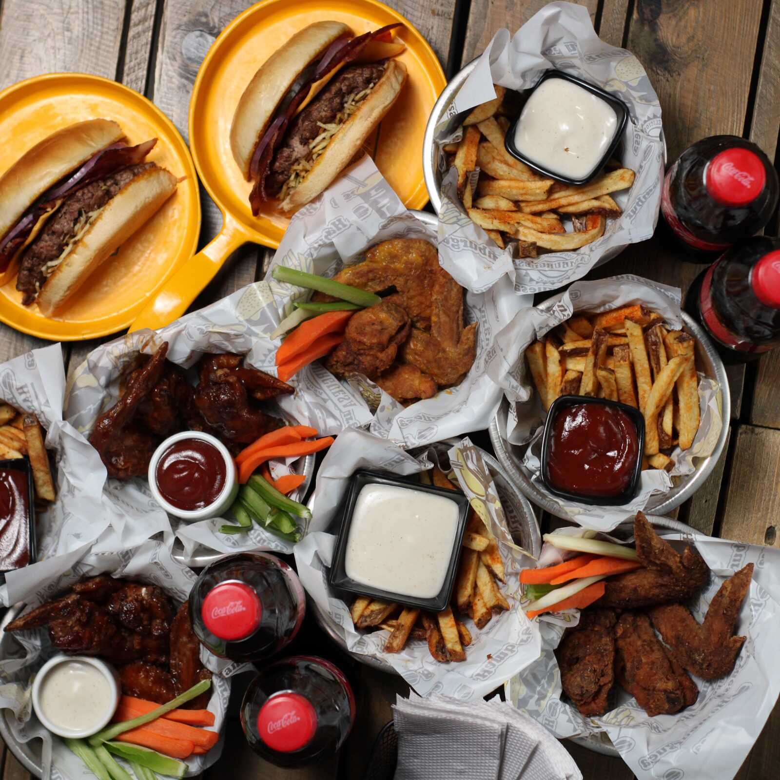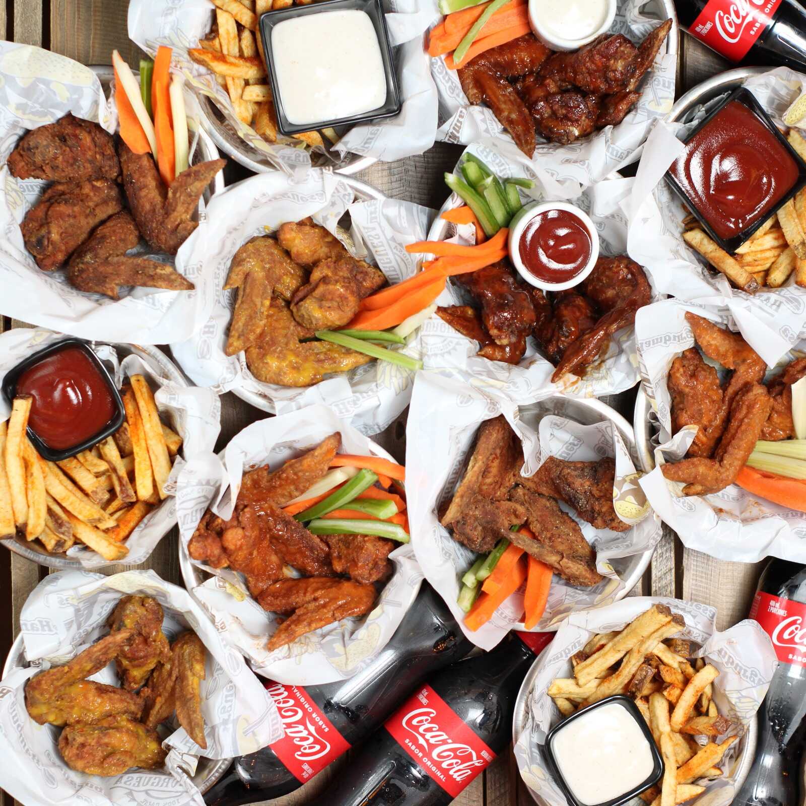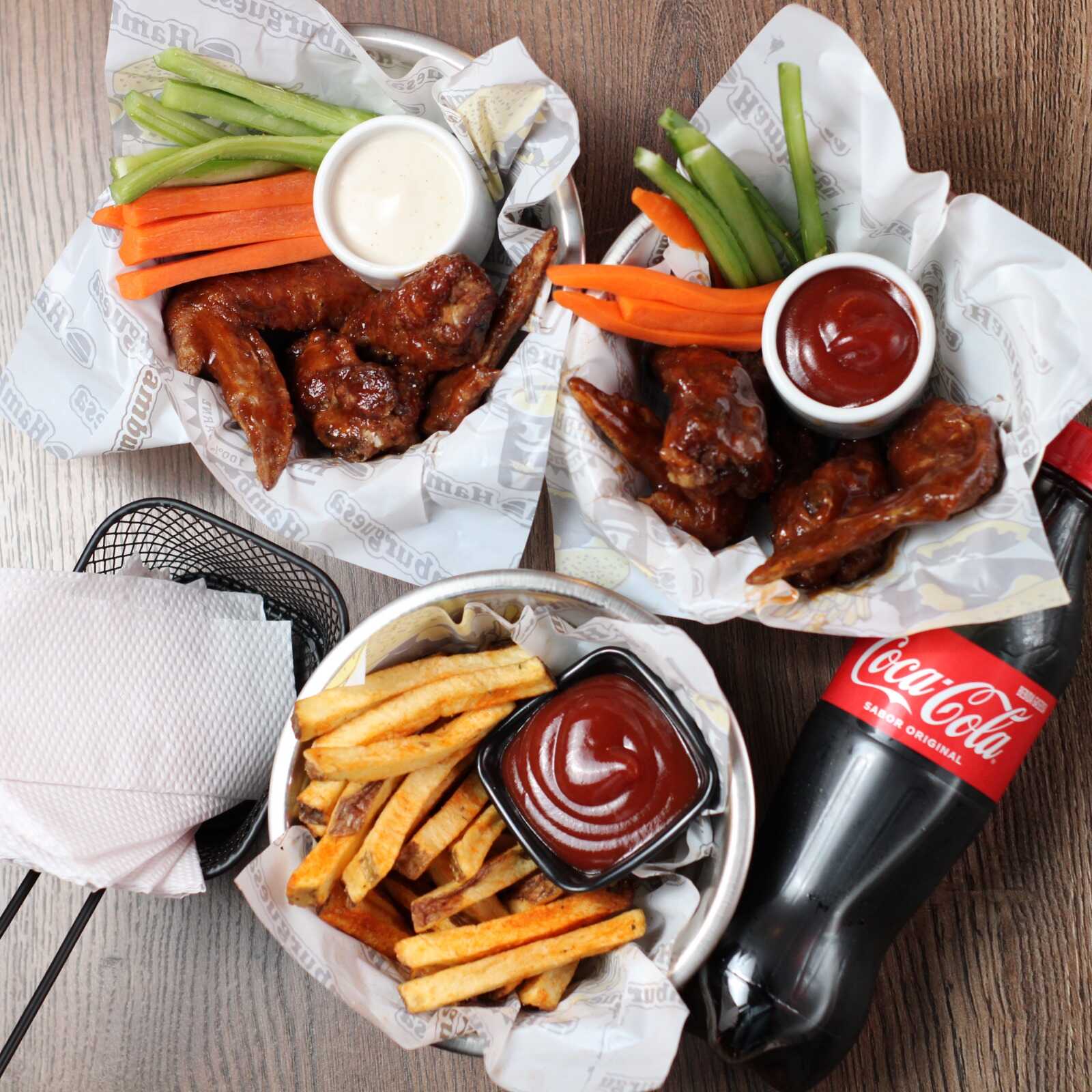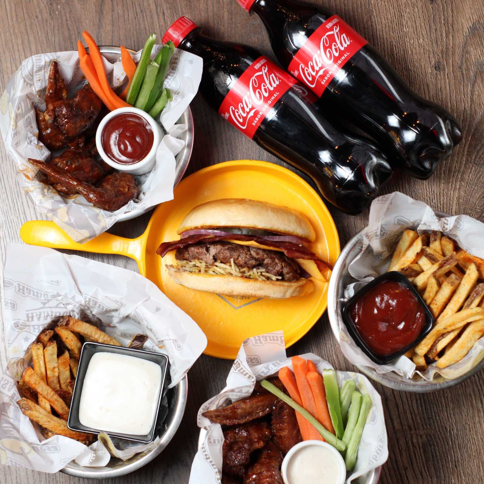 16 Piezas de alitas de pollo fritas y marinadas en especias de la casa más 2 hamburguesas cheese bacon más 4 papas artesanales y 4 bebidas.