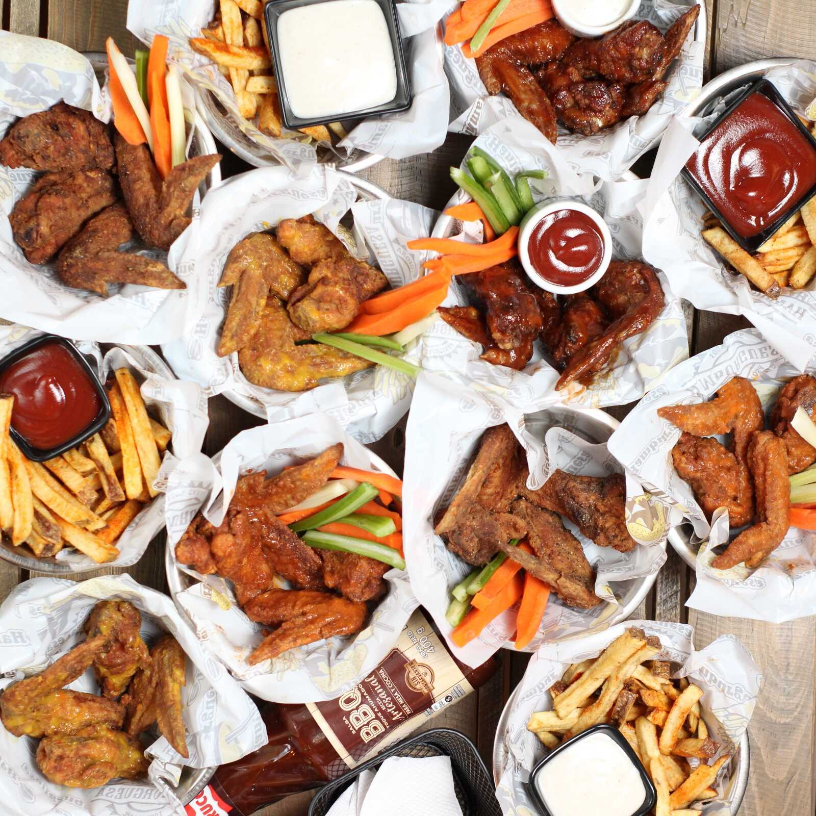 16 alitas de pollo fritas acompañadas con 2 porciones de bastones de zanahoria y apio, salsa ranch + 2 porciones de papas a elección