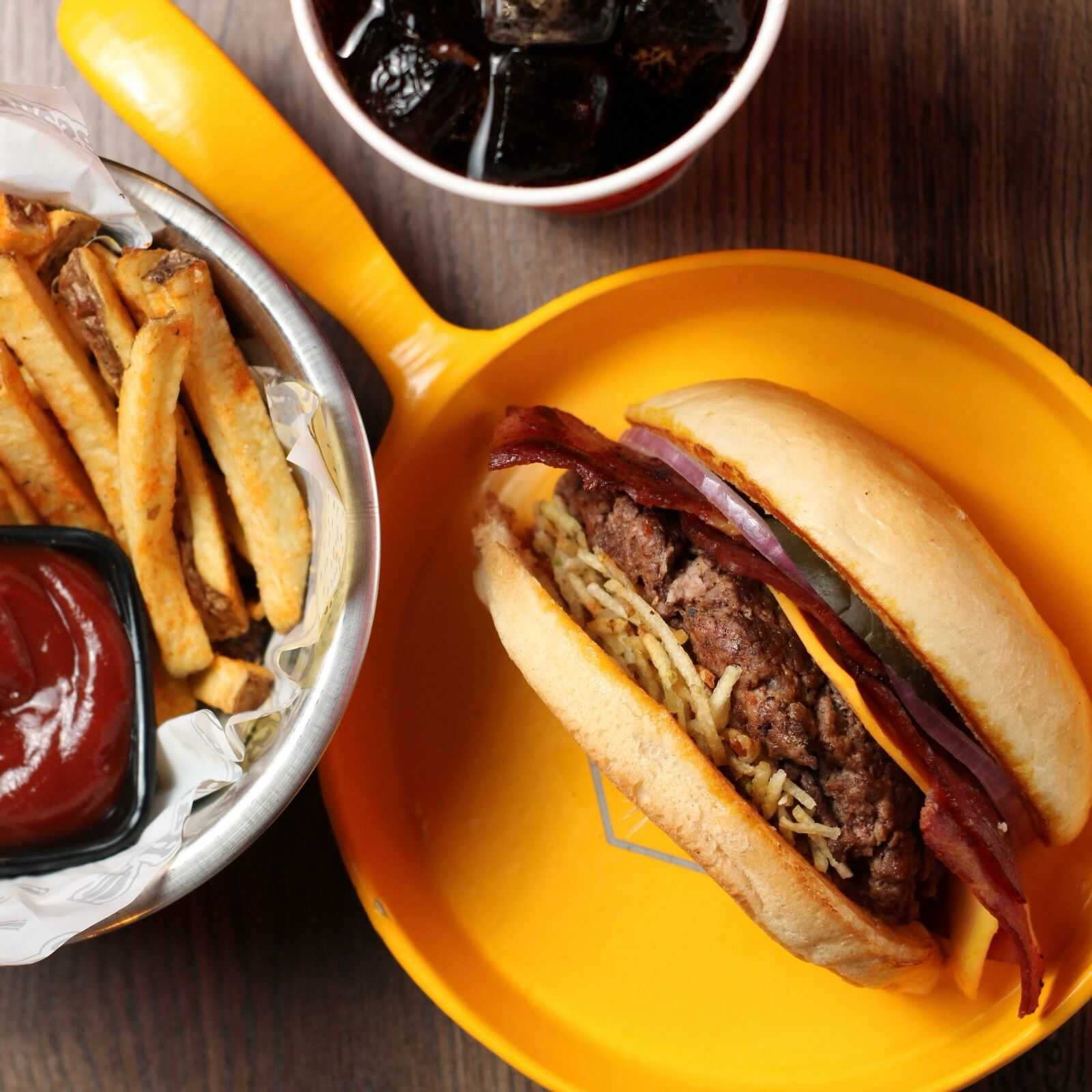 Hamburguesa 1/4 de lb, queso cheddar, doble tocineta, papas chip, vegetales, salsa, papas y bebida a elección.