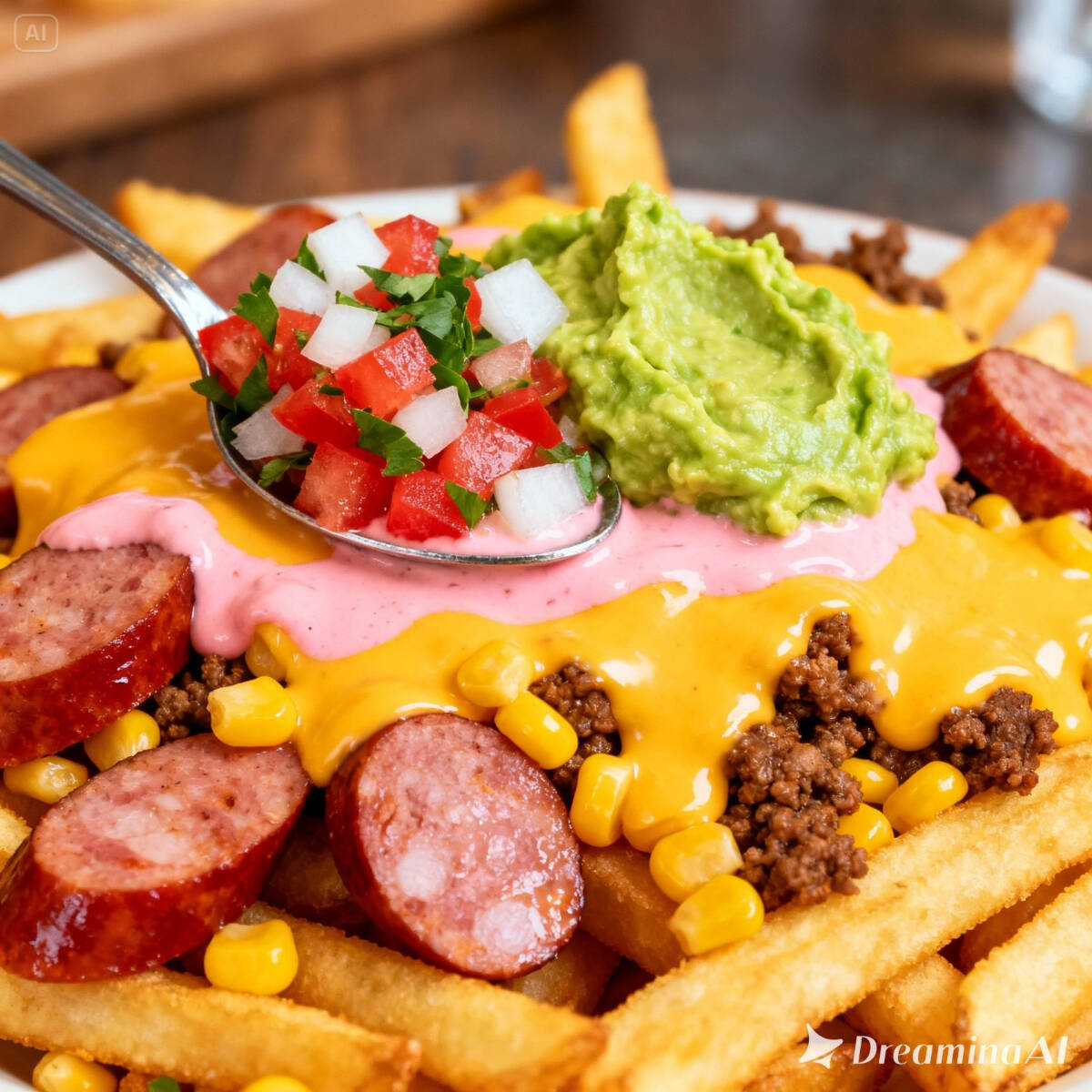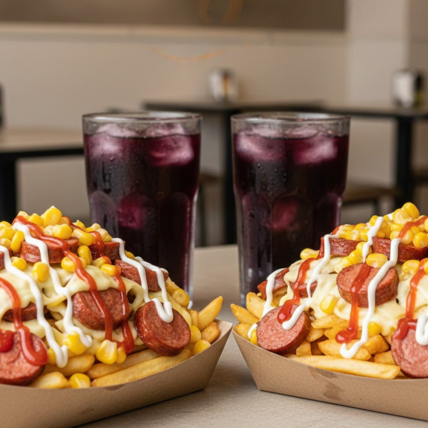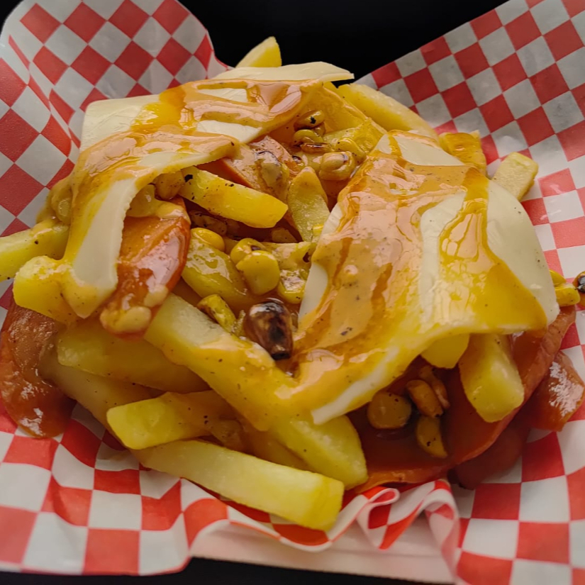 Papas a la francesa 300g, salchicha , queso Mozarella derretido, Maiz tierno salteado.
