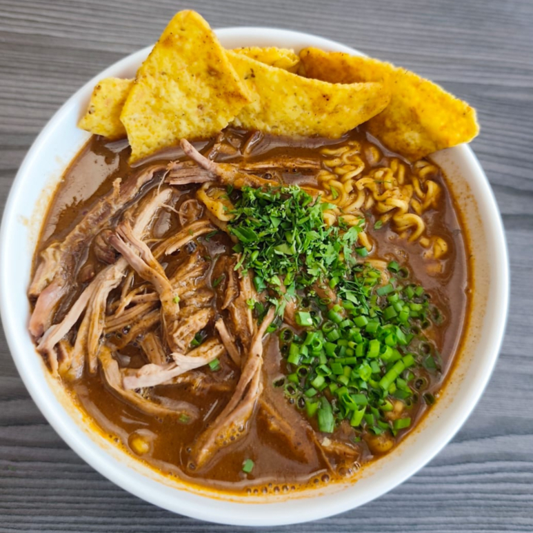 (mejoramos el plato) 300ml Caldo de Birria, 50gr carne desmechada, cebolla con cilantro, 80gr pasta ramen. (los nachos son por aparte con un precio adicional)
