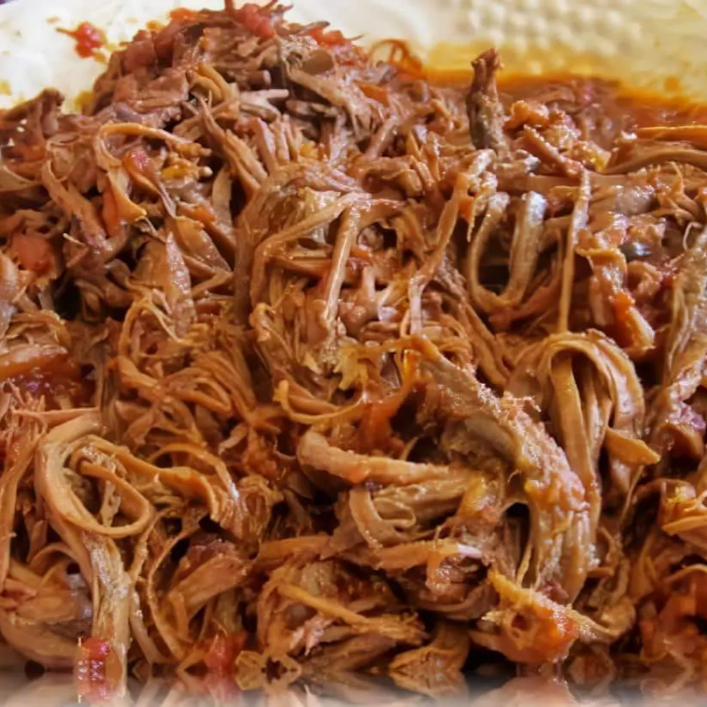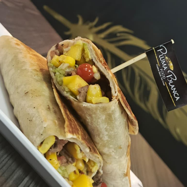 Tortilla de trigo rellena de carne de res desmechada, lechuga, mango, pico de gallo, guacamole, y salsa de la casa