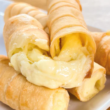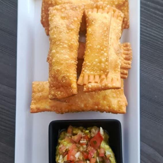 5 Tequeños artesanales rellenos de jamón y queso, dorados y crujientes acompañados de guacamole