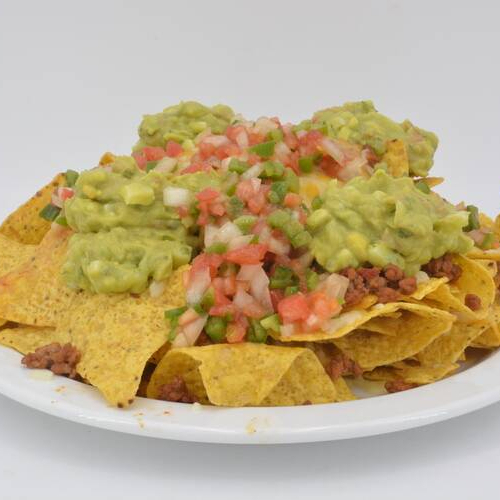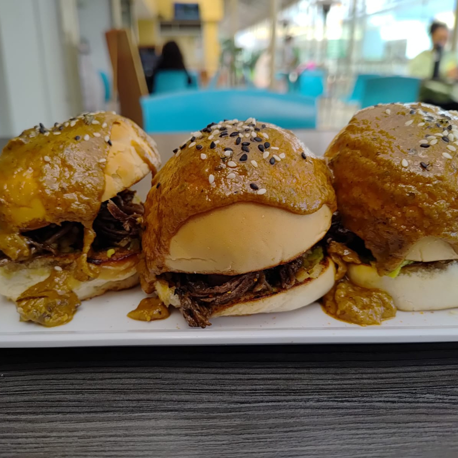 3 mini hamburguesas con carne desmechada, carne de hamburguesa, pico de gallo, guacamole, nachos triturados y salsa de queso de birria