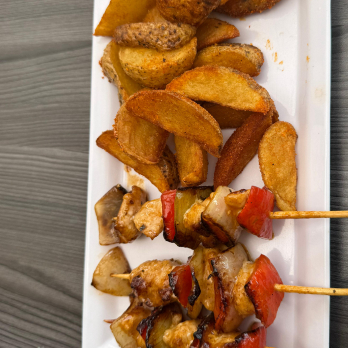 Deliciosos pinchos de pollo con cebolla y pimenton bañados en salsa de la casa, acompañados de papas casco.