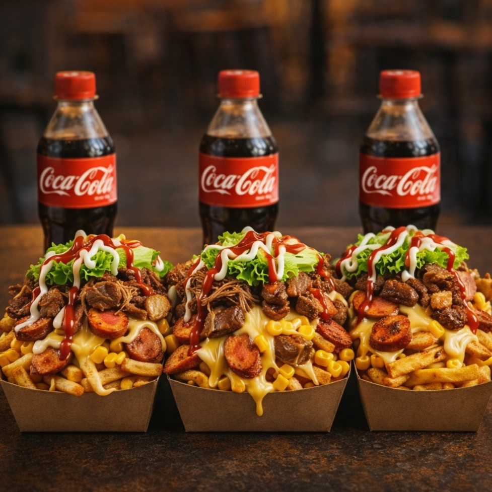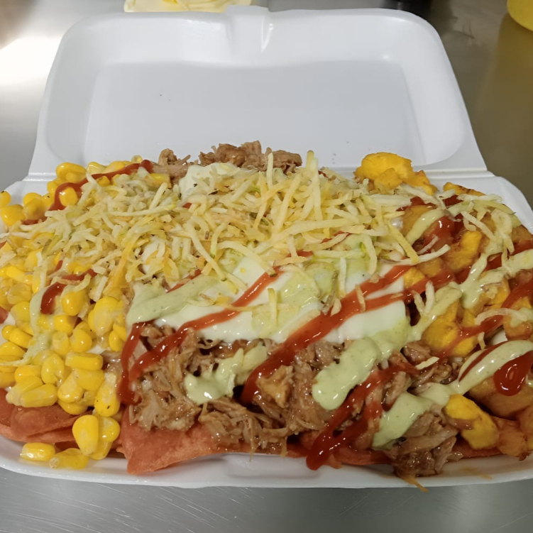 300gr papa francesa, salchicha, carne desmechada, pollo y carne de res salteado, maiz tierno, y papa fosforo.