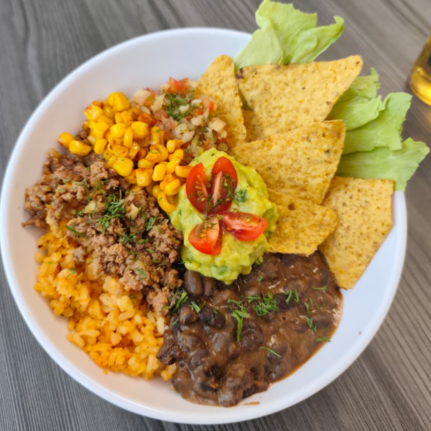 Carne molida, acompañado de frijol caraota, arroz atomatado, totopos y ensalada, guacamole y pico de gallo