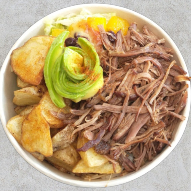 Carne desmechada , arroz con fideos tipico colombiano, papas casco ,flor de aguacate ,ensalada de temporada.