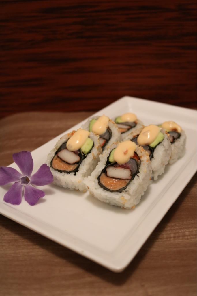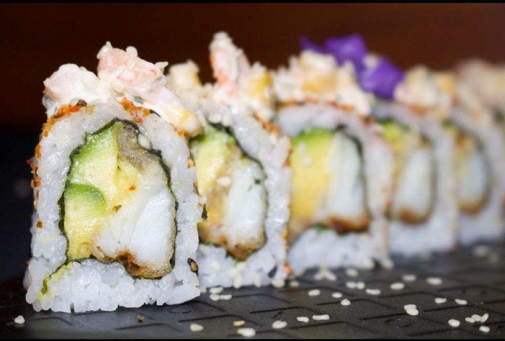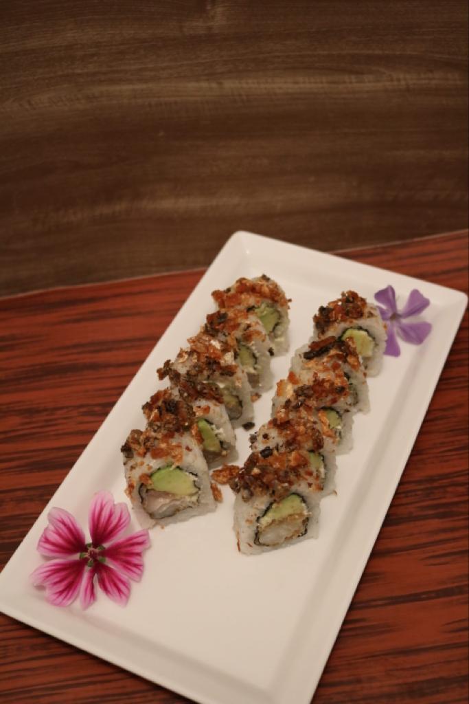Maki relleno de pescado tempura, aguacate, queso crema, mayonesa japonesa, bañado con un topping de skin de salmón.