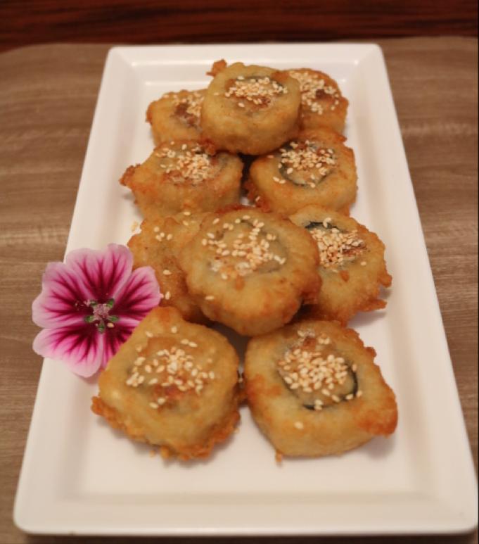 Maki tempura, relleno de pescado blanco, queso crema, ajonjolí tostado