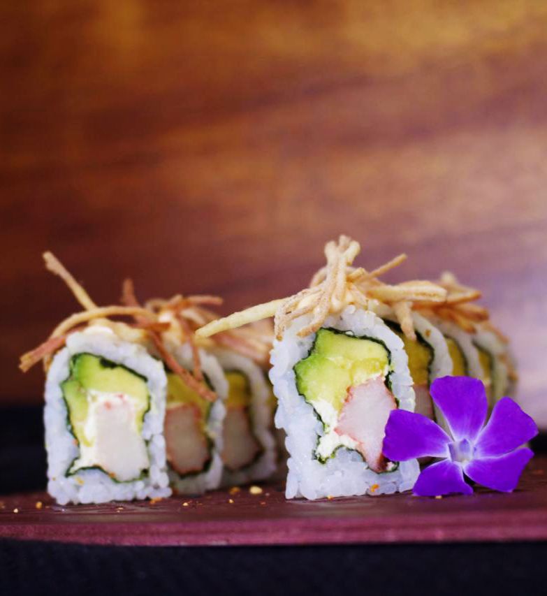 Maki relleno de kanikama, aguacate, queso crema, acompañado de hilos rebosados de kanikama en salsa samurái.