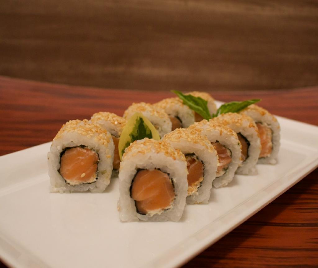 Maki relleno de salmón, queso crema, con un topping de ajonjolí tostado.