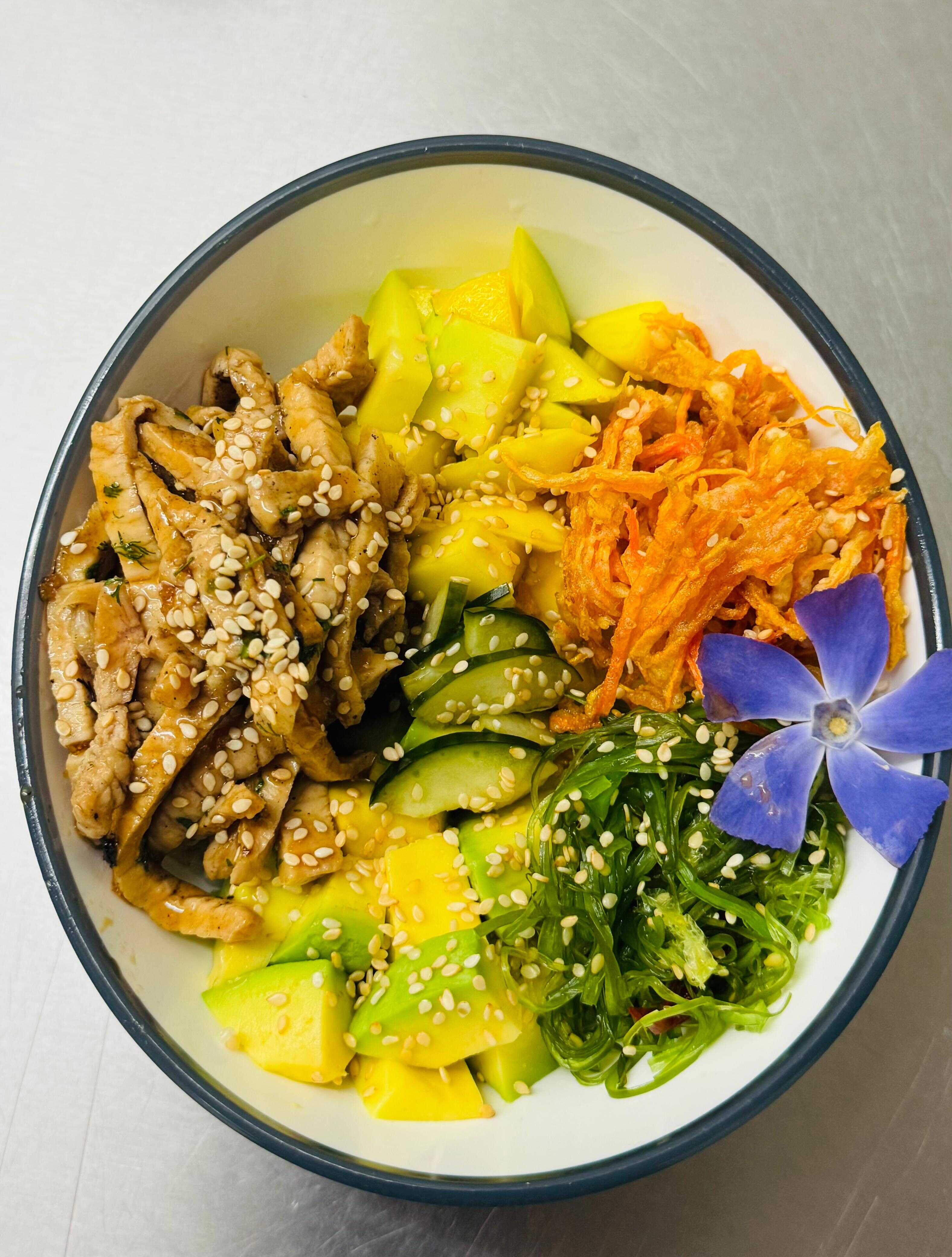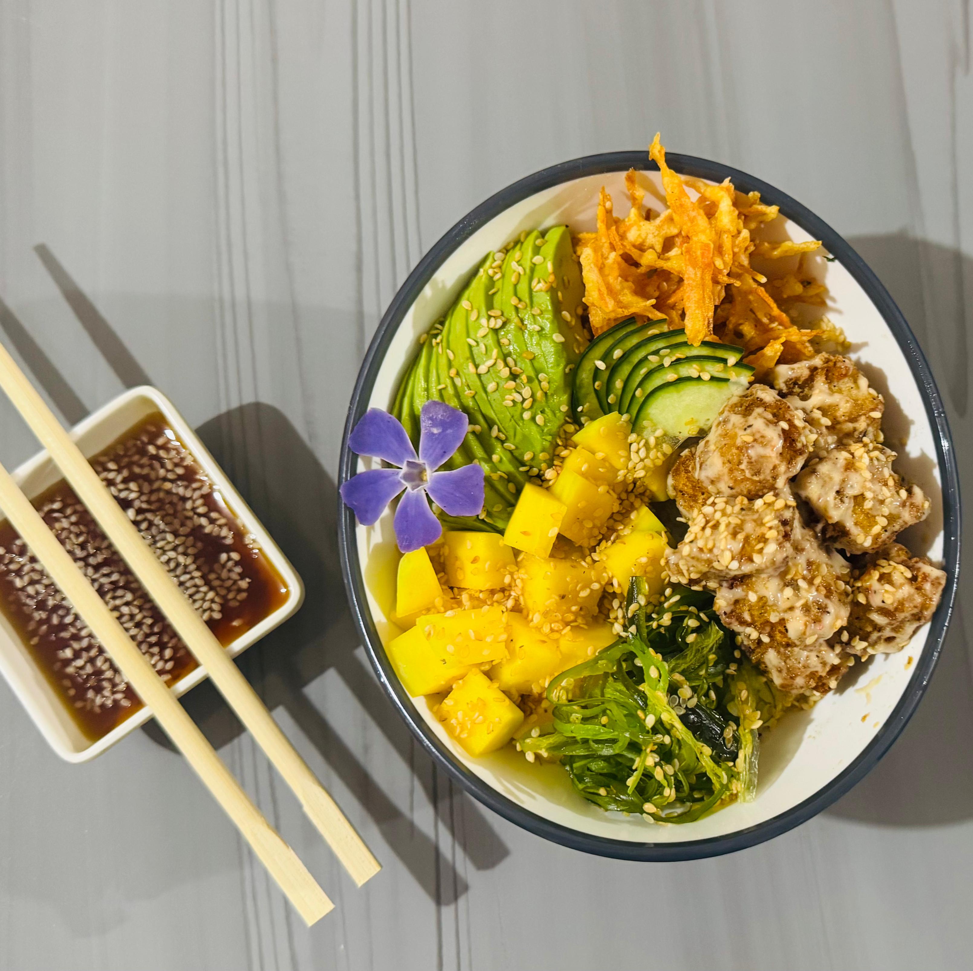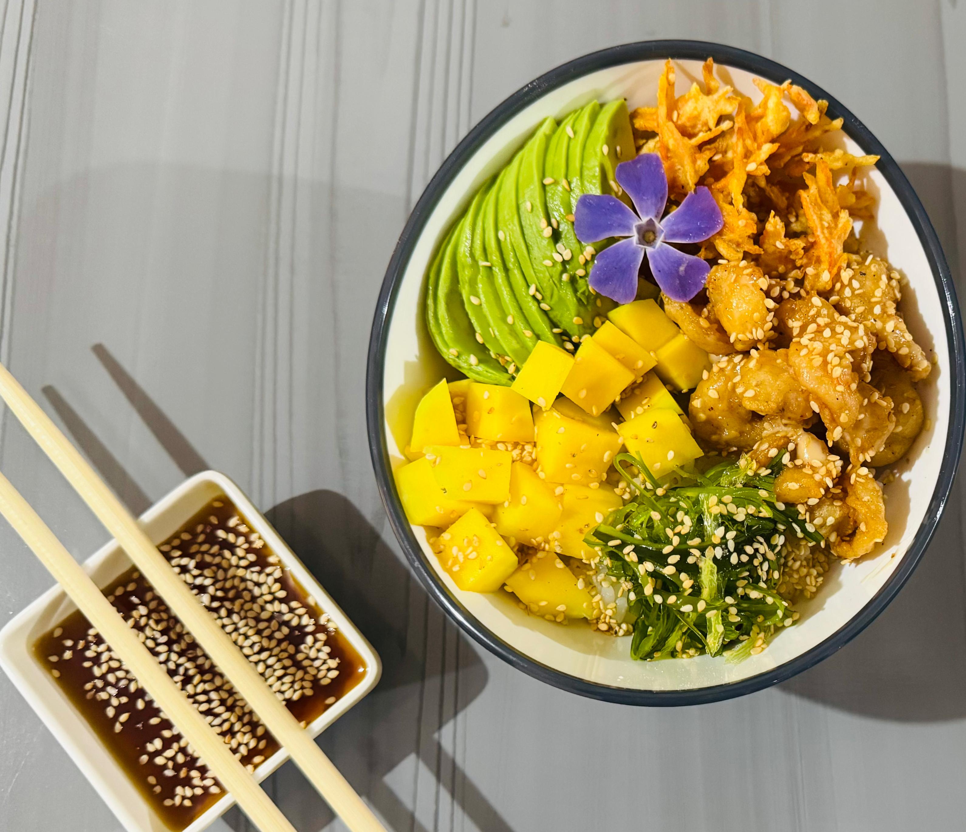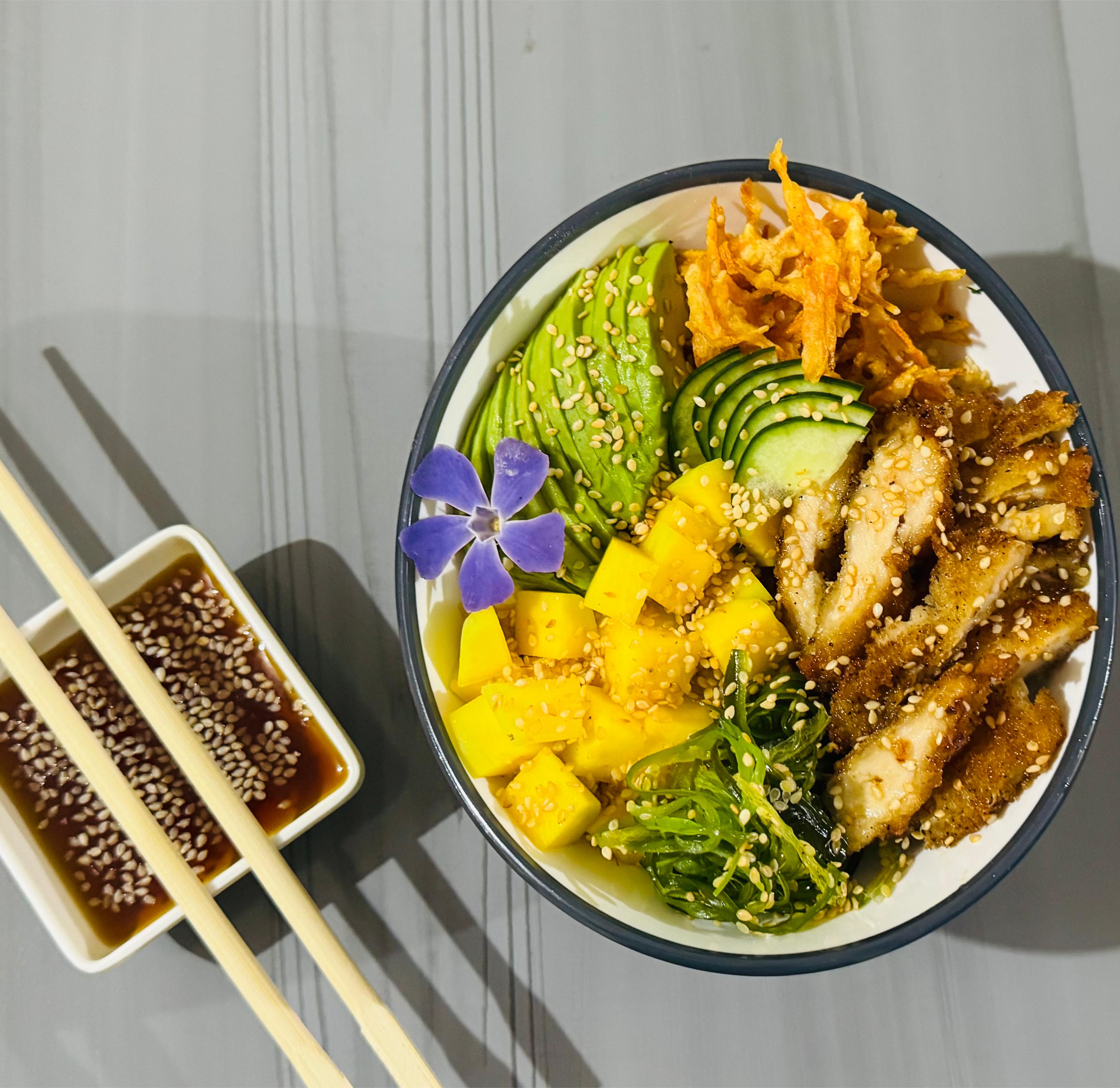 Pollo apanado rebosado en salsa samurai, acompañado con arroz de sushi, aguacate, zanahoria crocante, ajonjolí, pepino encurtido, ensalada algas, mango, acompañado de salsa ponzu