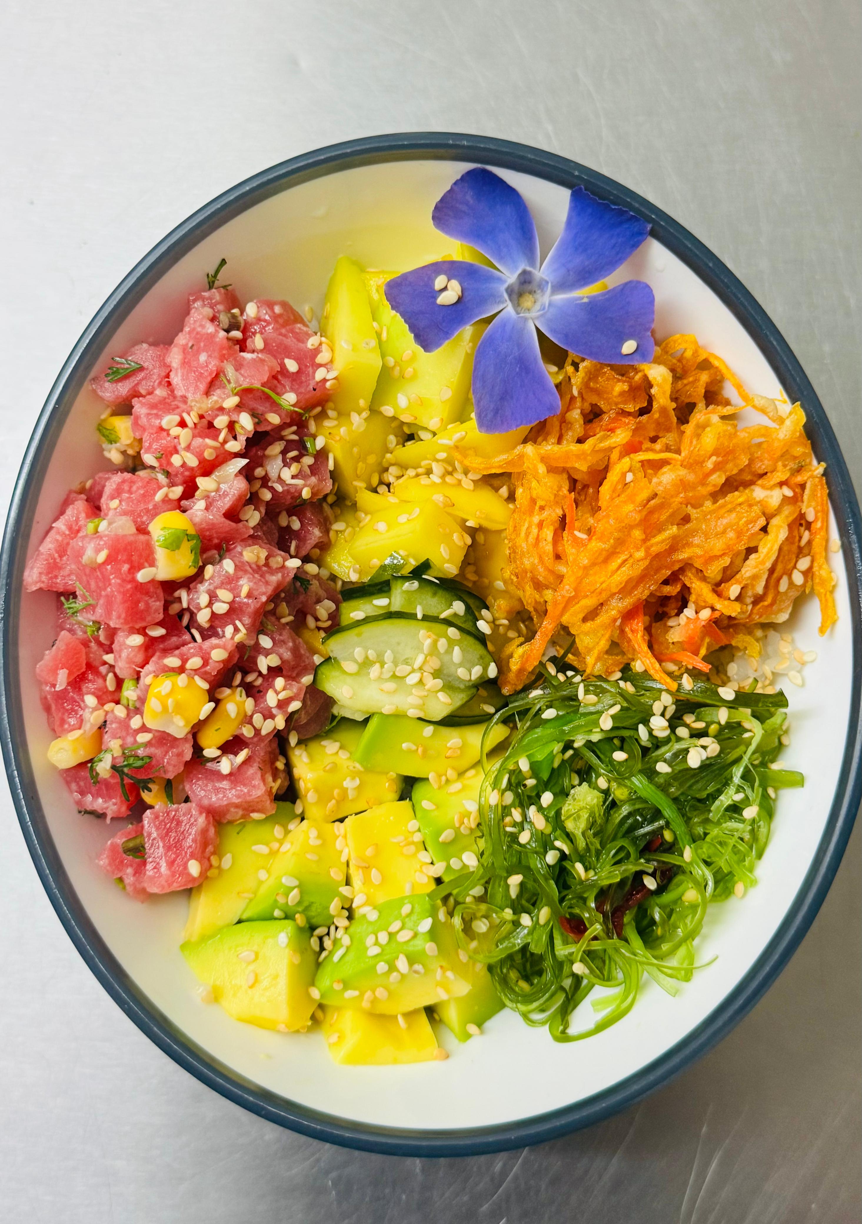 Tartar de atún con mezcla de mayonesa japonesa un toque de cilantro y maíz, acompañado arroz sushi, Aguacate, zanahoria crocante, ajonjolí, pepino encurtido,Ensalada algas, mango. Acompañado de salsa ponzu.