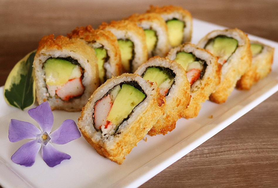 Maki kronch, relleno de kanikama, queso crema, masago, aguacate, pepino europeo.