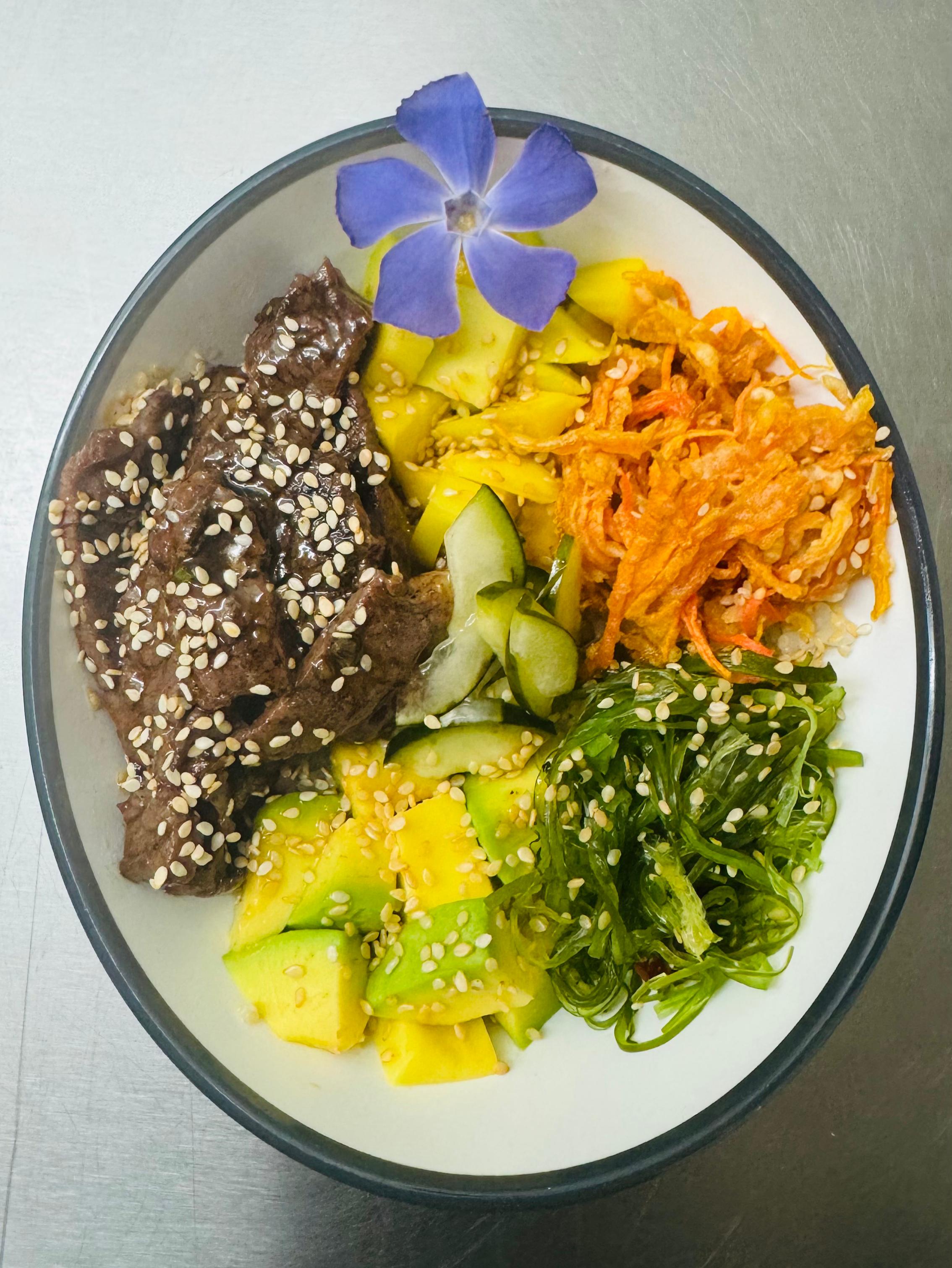 Lomo de res salteado en salsa teriyaki y ajonjolí, acompañado arroz sushi, Aguacate, zanahoria crocante, ajonjolí, pepino encurtido,Ensalada algas, mango. Acompañado de salsa ponzu.