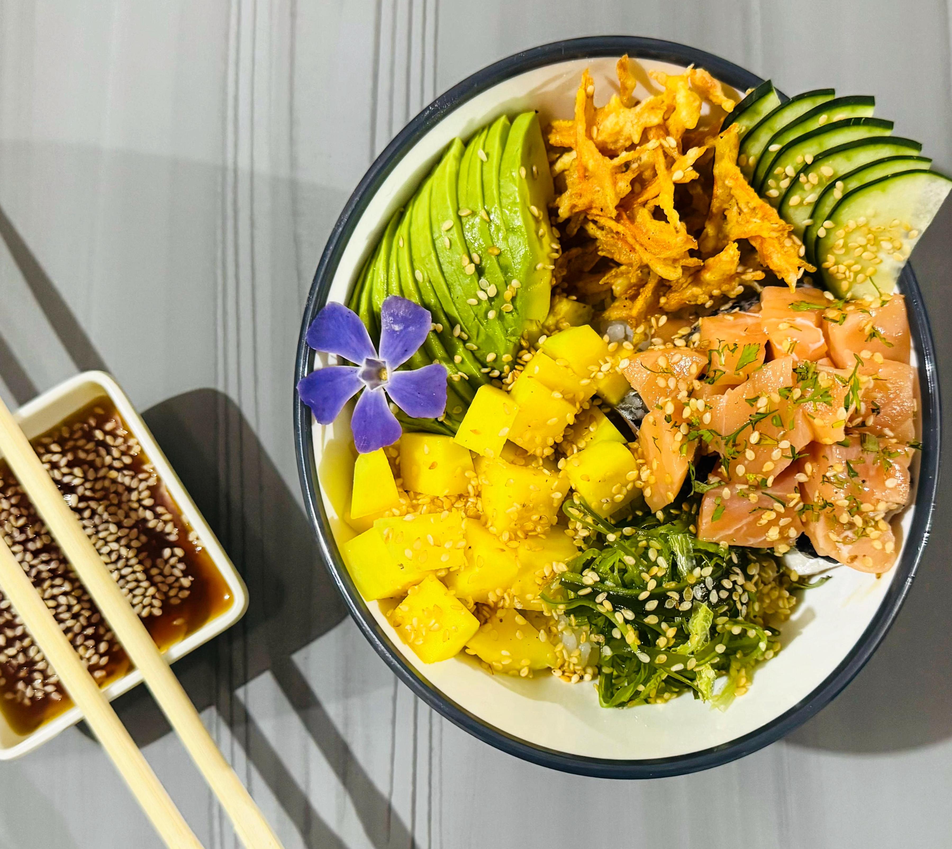 Tartar salmón con mezcla de mayonesa japonesa, acompañado arroz sushi, Aguacate, zanahoria crocante, ajonjolí, pepino encurtido,Ensalada algas, mango. Acompañado de salsa ponzu.