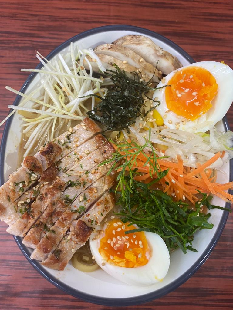 Láminas de cerdo a la plancha, pasta ramen, vegetales (cebolla puerro, zanahoria, Champiñón , maíz) huevo cocido, con un caldillo de sopa miso.