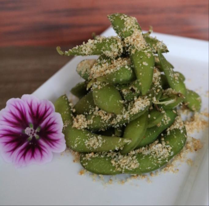 Edamames al vapor, bañados en una sal de ajonjolí.