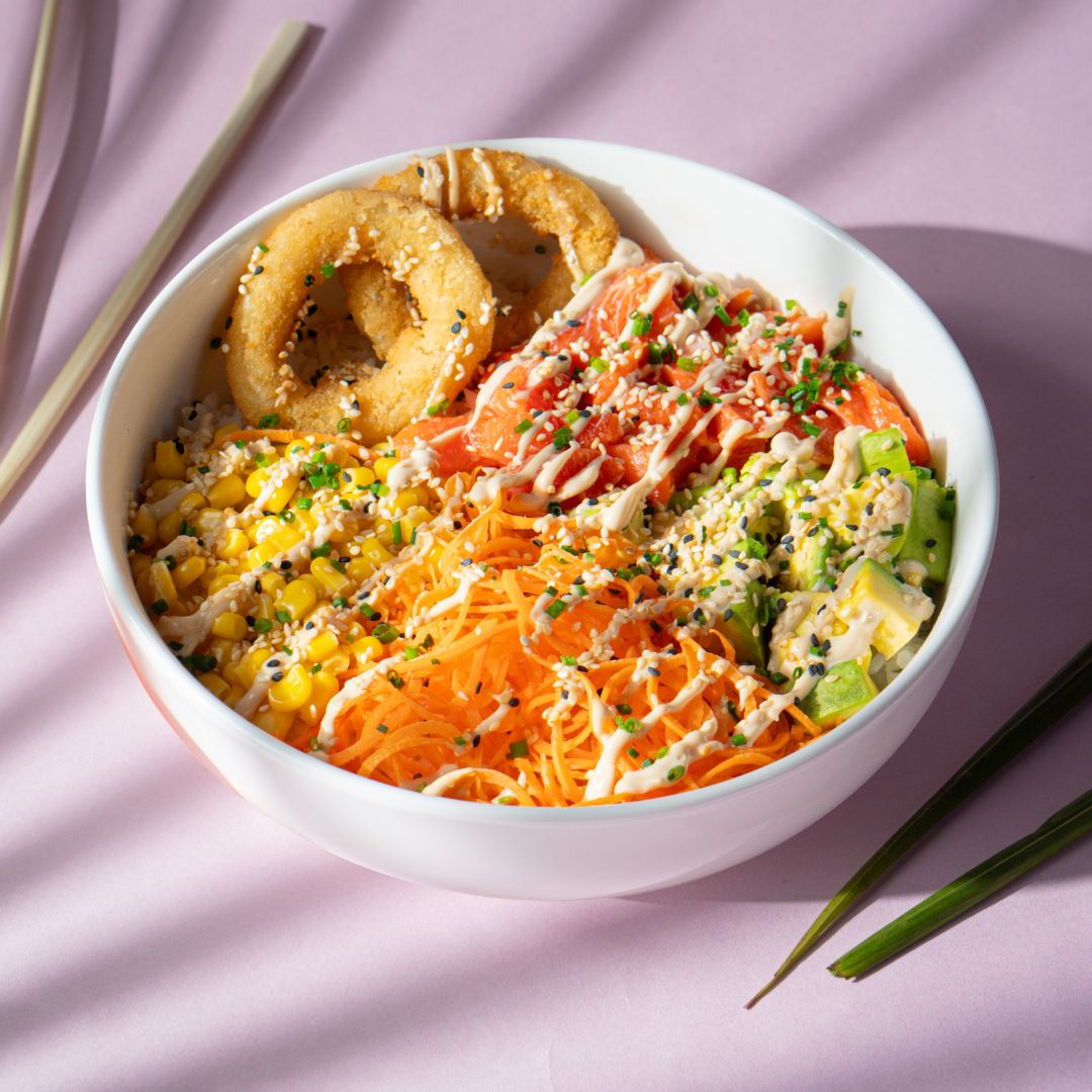 Poke con arroz de sushi, salmon fresco, aguacate, maíz tierno, aros de cebolla, zanahoria, ajonjolí, cebollín, y salsa